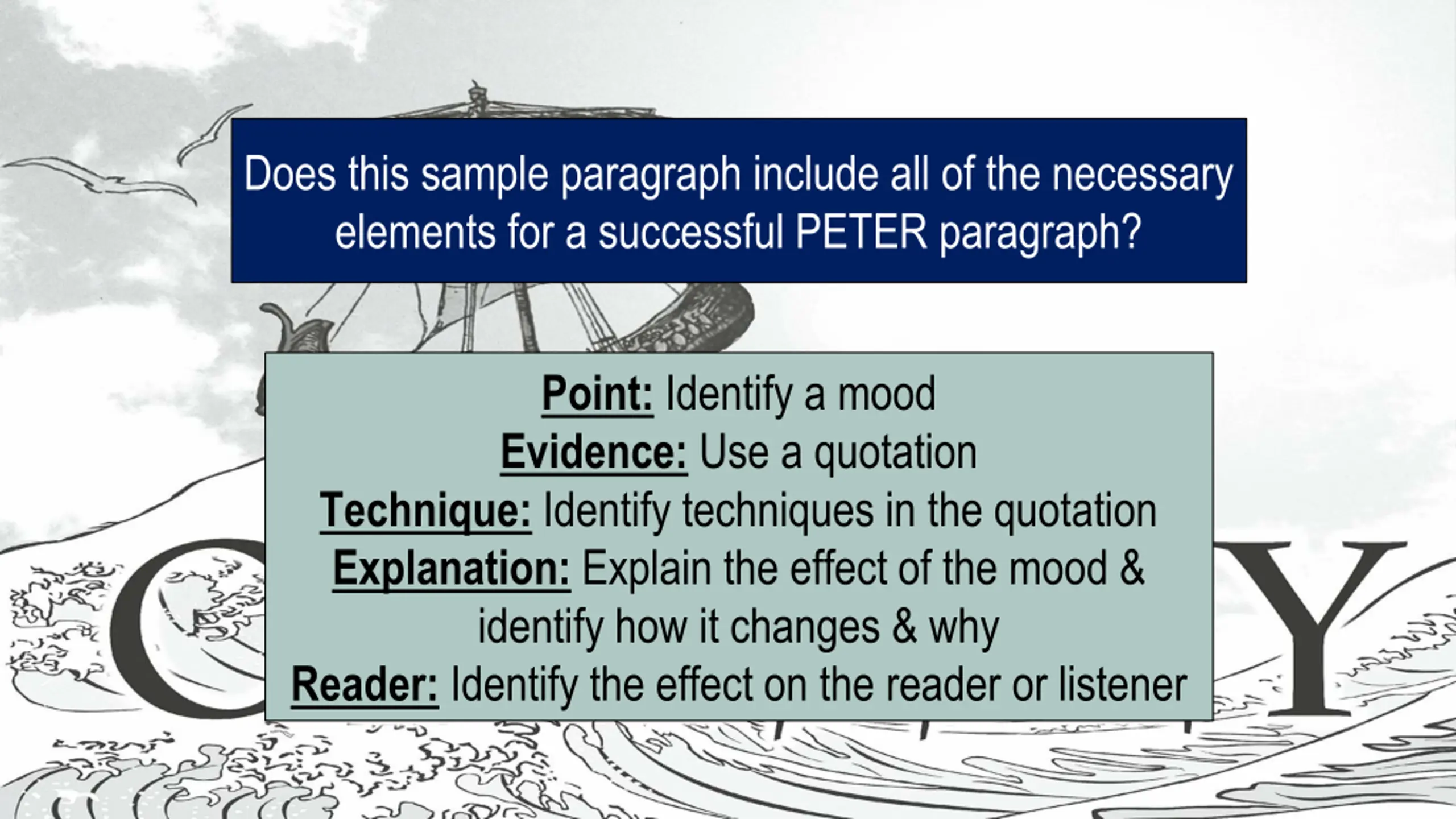 Does this sample paragraph include all of the necessary elements for a successful PETER paragraph? Point: Identify a mood Evidence: Use a quotation Technique: Identify techniques in the quotation Explanation: Explain the effect of the mood & identify how it changes & why Reader: Identify the effect on the reader or listener