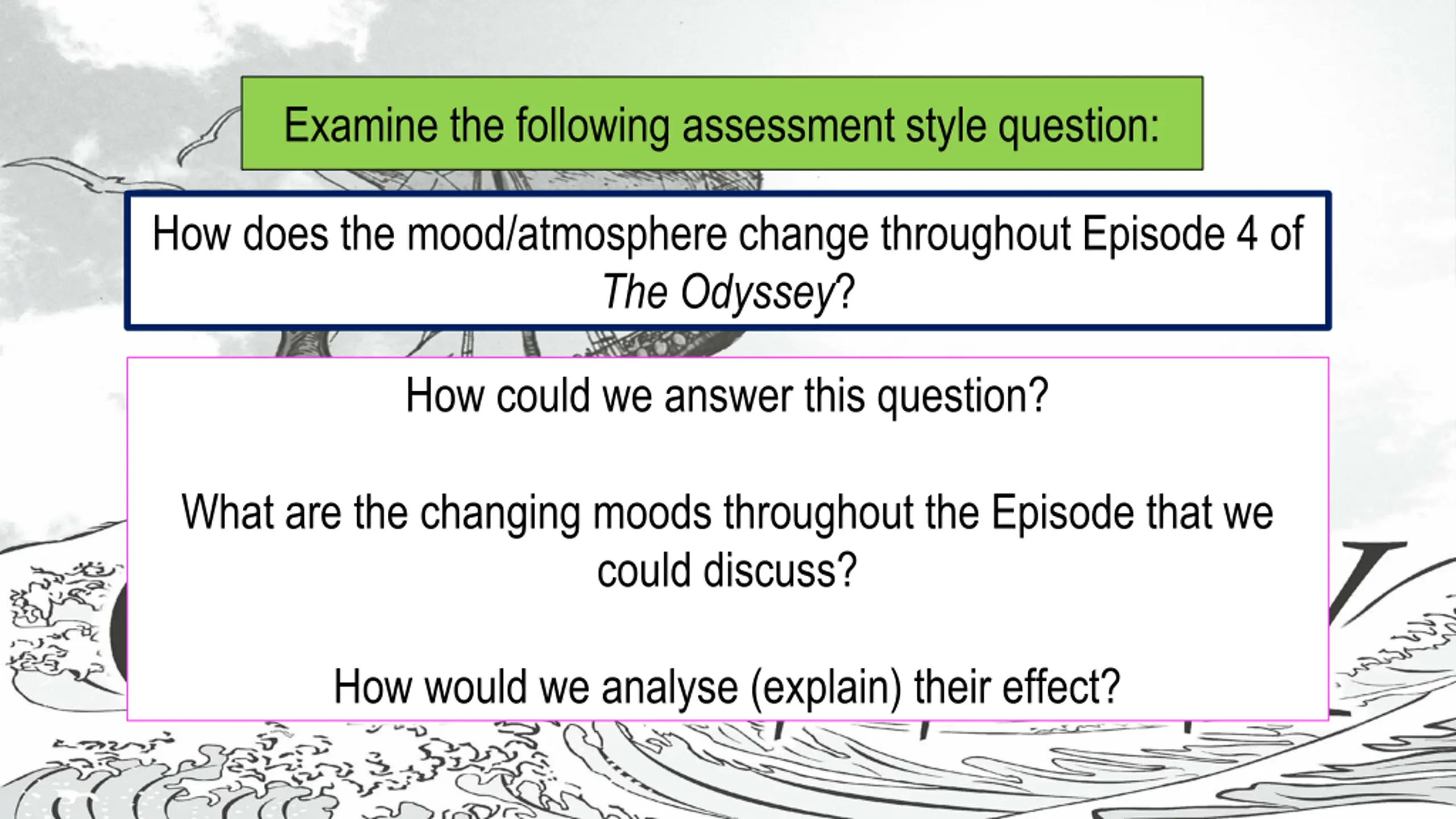 Examine the following assessment style question: How does the mood/atmosphere change throughout Episode 4 of The Odyssey? How could we answer this question? What are the changing moods throughout the Episode that we could discuss? How would we analyse (explain) their effect?