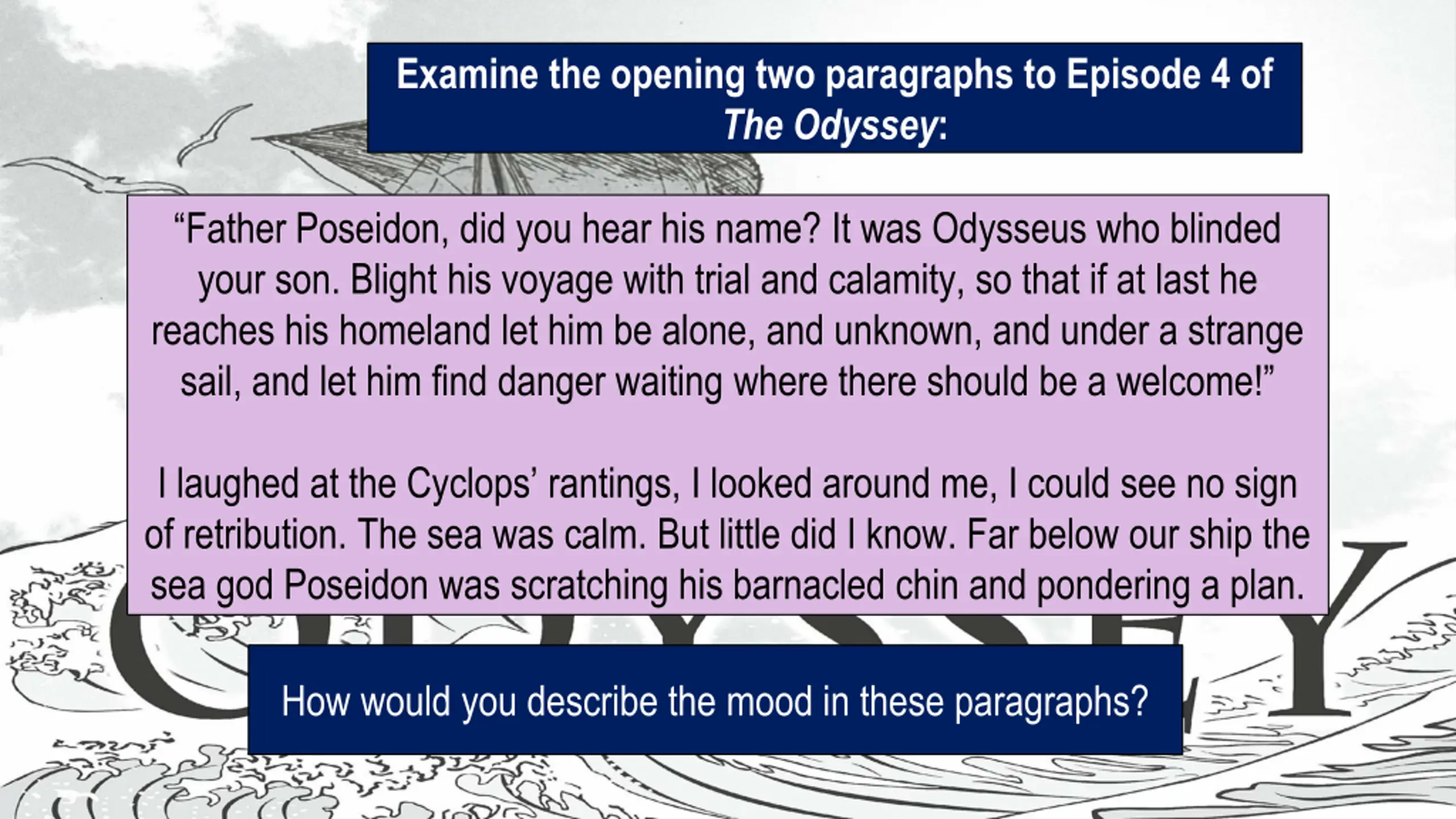 Examine the opening two paragraphs to Episode 4 of The Odyssey: Father Poseidon, did you hear his name? It was Odysseus who blinded your son. Blight his voyage with trial and calamity, so that if at last he reaches his homeland let him be alone, and unknown, and under a strange sail, and let him find danger waiting where there should be a welcome! I laughed at the Cyclops rantings, I looked around me, I could see no sign of retribution. The sea was calm. But little did I know. Far below our ship the sea god Poseidon was scratching his barnacled chin and pondering a plan. How would you describe the mood in these paragraphs?