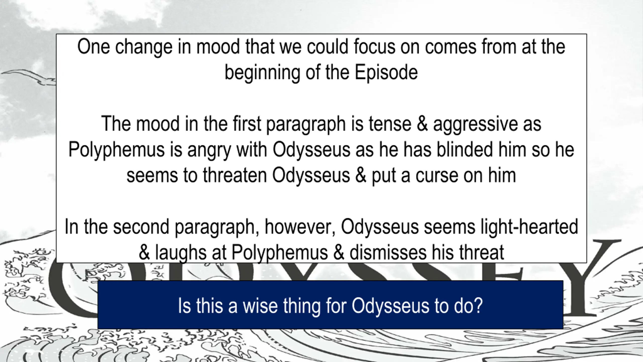 One change in mood that we could focus on comes from at the beginning of the Episode The mood in the first paragraph is tense & aggressive as Polyphemus is angry with Odysseus as he has blinded him so he seems to threaten Odysseus & put a curse on him In the second paragraph, however, Odysseus seems light-hearted & laughs at Polyphemus & dismisses his threat Is this a wise thing for Odysseus to do?