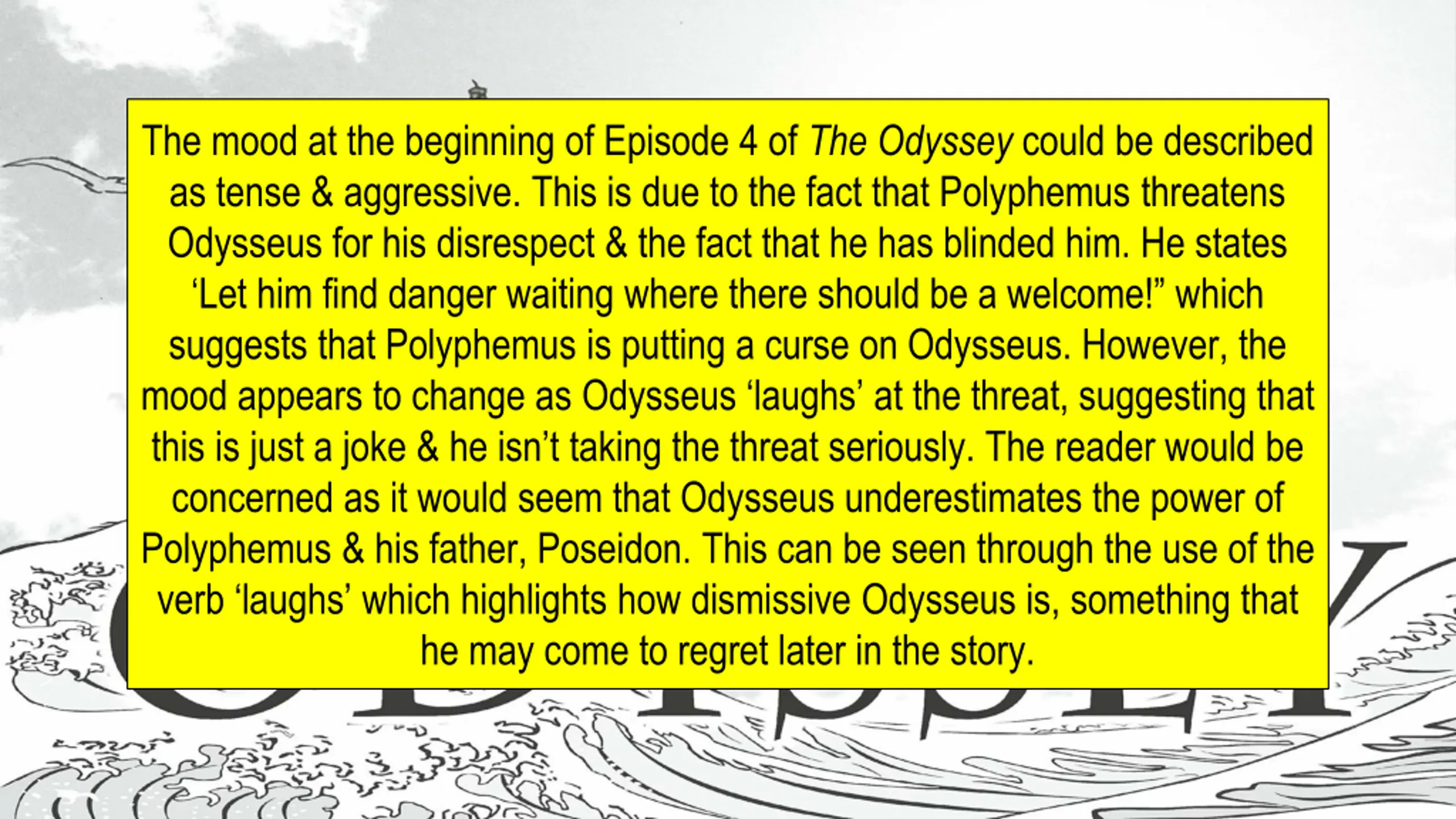 The mood at the beginning of Episode 4 of The Odyssey could be described as tense & aggressive. This is due to the fact that Polyphemus threatens Odysseus for his disrespect & the fact that he has blinded him. He states Let him find danger waiting where there should be a welcome! which suggests that Polyphemus is putting a curse on Odysseus. However, the mood appears to change as Odysseus laughs at the threat, suggesting that this is just a joke & he isn t taking the threat seriously. The reader would be concerned as it would seem that Odysseus underestimates the power of Polyphemus & his father, Poseidon. This can be seen through the use of the verb laughs which highlights how dismissive Odysseus is, something that he may come to regret later in the story.
