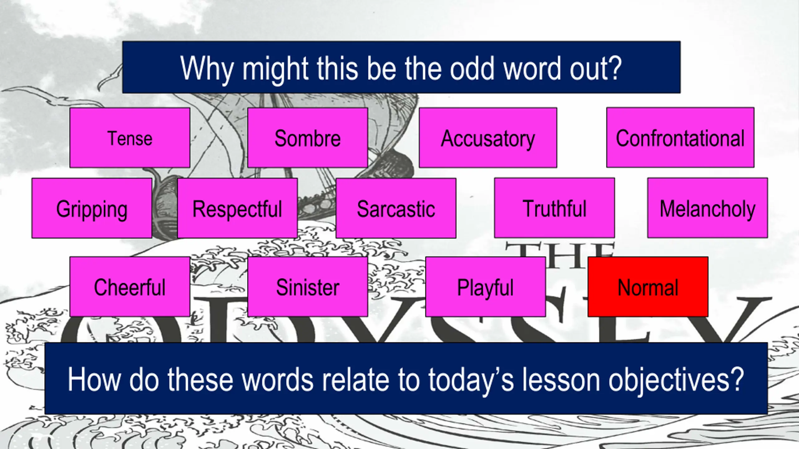 Why might this be the odd word out? Confrontational Sombre Accusatory Tense Truthful Melancholy Gripping Respectful Sarcastic Cheerful Sinister Playful Normal How do these words relate to today s lesson objectives?