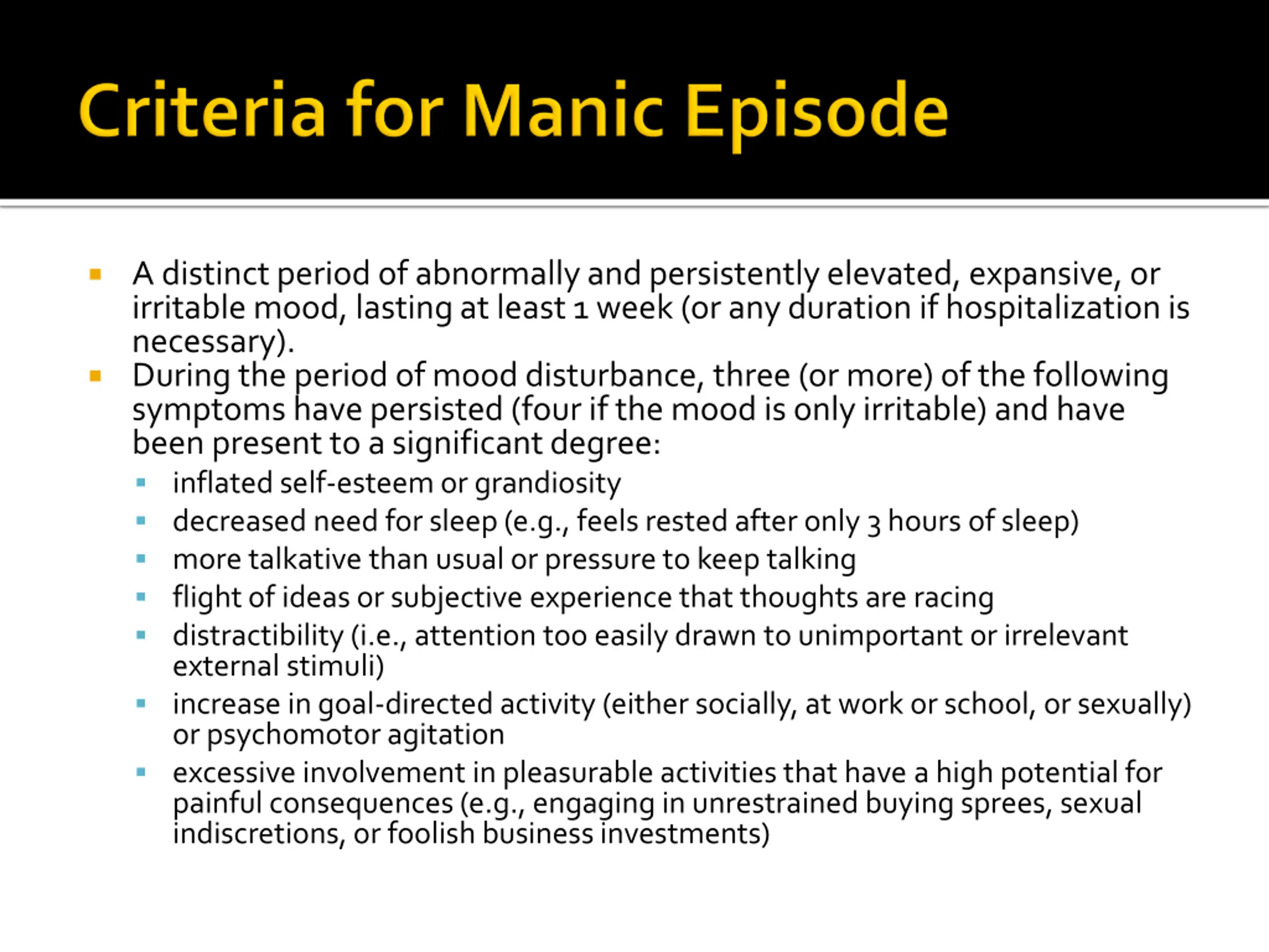 A distinct period of abnormally and persistently elevated, expansive, or irritable mood, lasting at least 1 week (or any duration if hospitalization is necessary). During the period of mood disturbance, three (or more) of the following symptoms have persisted (four if the mood is only irritable) and have been present to a significant degree: inflated self-esteem or grandiosity decreased need for sleep (e.g., feels rested after only 3 hours of sleep) more talkative than usual or pressure to keep talking flight of ideas or subjective experience that thoughts are racing distractibility (i.e., attention too easily drawn to unimportant or irrelevant external stimuli) increase in goal-directed activity (either socially, at work or school, or sexually) or psychomotor agitation excessive involvement in pleasurable activities that have a high potential for painful consequences (e.g., engaging in unrestrained buying sprees, sexual indiscretions, or foolish business investments)