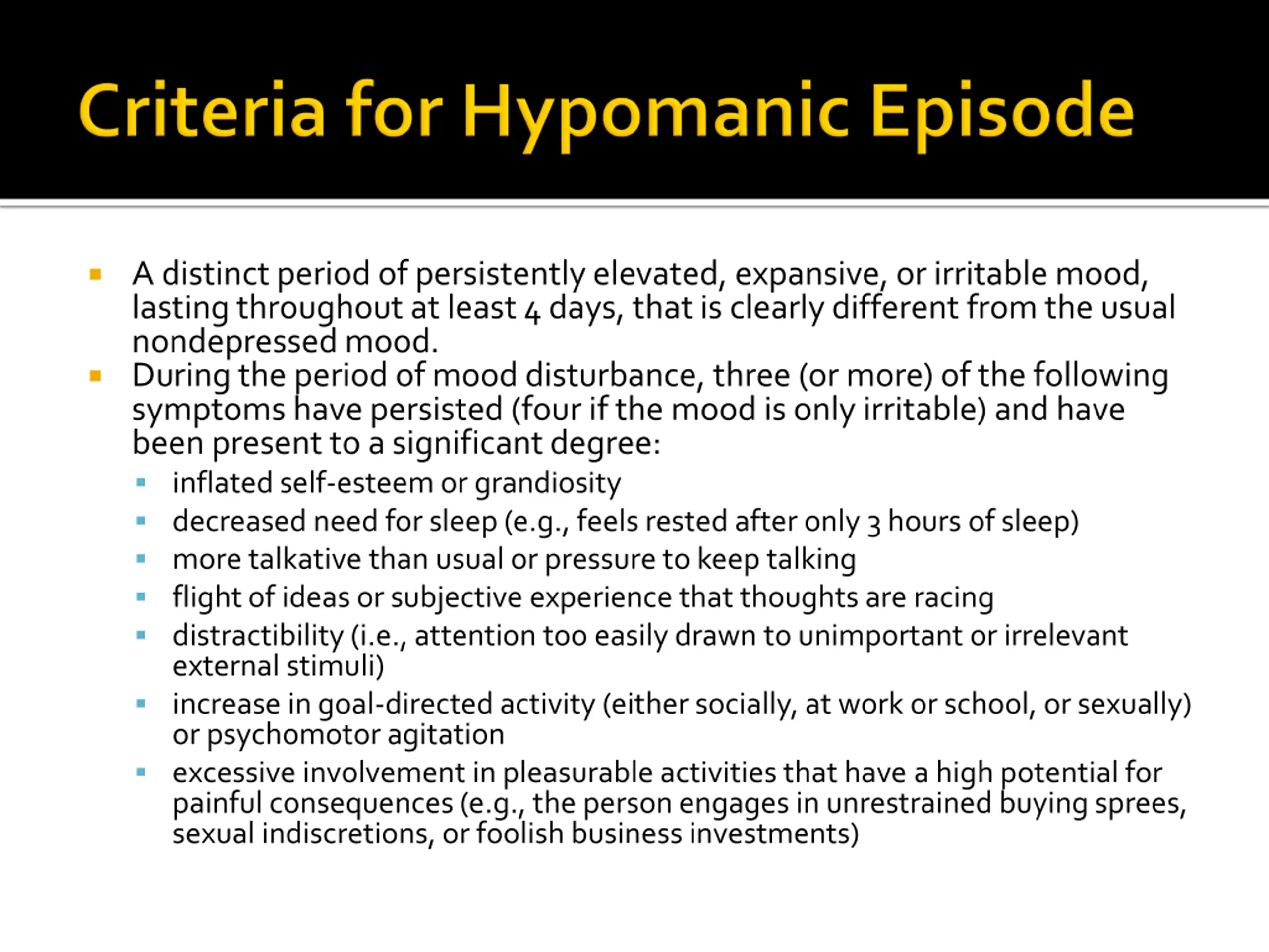 A distinct period of persistently elevated, expansive, or irritable mood, lasting throughout at least 4 days, that is clearly different from the usual nondepressed mood. During the period of mood disturbance, three (or more) of the following symptoms have persisted (four if the mood is only irritable) and have been present to a significant degree: inflated self-esteem or grandiosity decreased need for sleep (e.g., feels rested after only 3 hours of sleep) more talkative than usual or pressure to keep talking flight of ideas or subjective experience that thoughts are racing distractibility (i.e., attention too easily drawn to unimportant or irrelevant external stimuli) increase in goal-directed activity (either socially, at work or school, or sexually) or psychomotor agitation excessive involvement in pleasurable activities that have a high potential for painful consequences (e.g., the person engages in unrestrained buying sprees, sexual indiscretions, or foolish business investments)