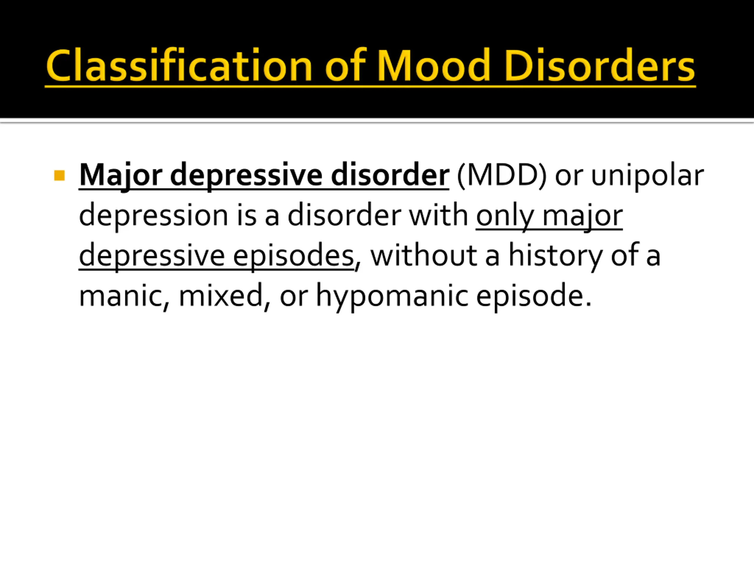Major depressive disorder (MDD) or unipolar depression is a disorder with only major depressive episodes, without a history of a manic, mixed, or hypomanic episode.