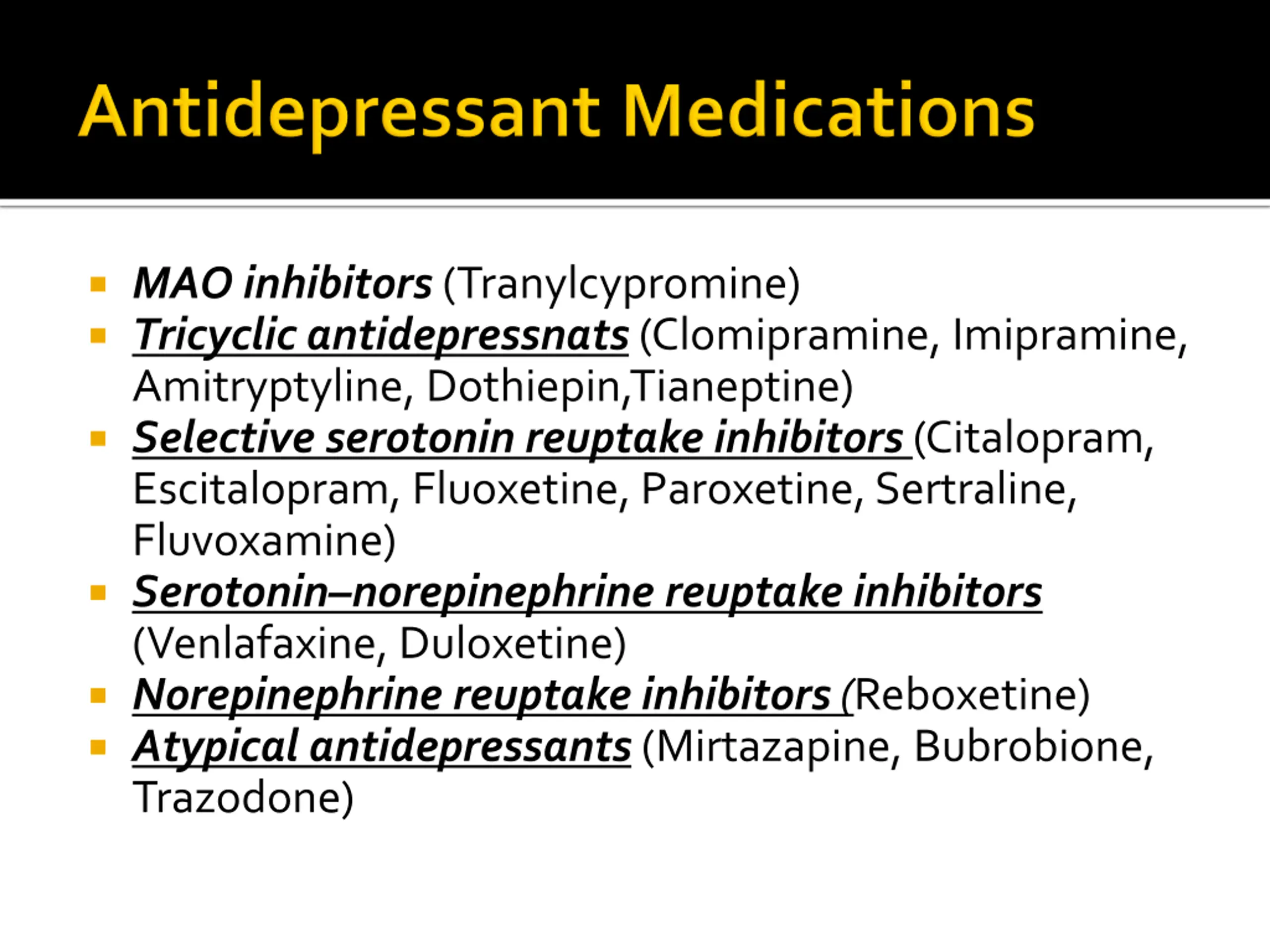 MAO inhibitors (Tranylcypromine) Tricyclic antidepressnats (Clomipramine, Imipramine, Amitryptyline, Dothiepin,Tianeptine) Selective serotonin reuptake inhibitors (Citalopram, Escitalopram, Fluoxetine,Paroxetine, Sertraline, Fluvoxamine) Serotonin norepinephrine reuptake inhibitors (Venlafaxine, Duloxetine) Norepinephrine reuptake inhibitors (Reboxetine) Atypical antidepressants (Mirtazapine, Bubrobione, Trazodone)