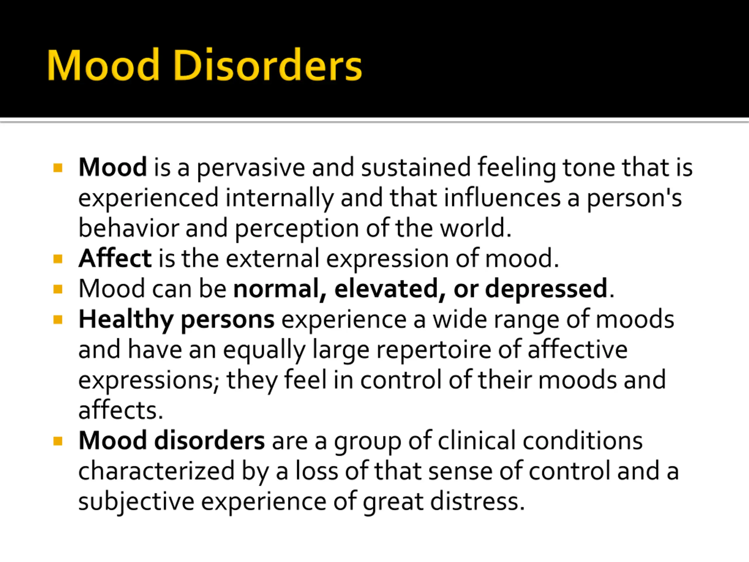 Mood is a pervasive and sustained feeling tone that is experienced internally and that influences a person's behavior and perception of the world. Affect is the external expression of mood. Mood can be normal, elevated, or depressed. Healthy persons experience a wide range of moods and have an equally large repertoire of affective expressions; they feel in control of their moods and affects. Mood disorders are a group of clinical conditions characterized by a loss of that sense of control and a subjective experience of great distress.