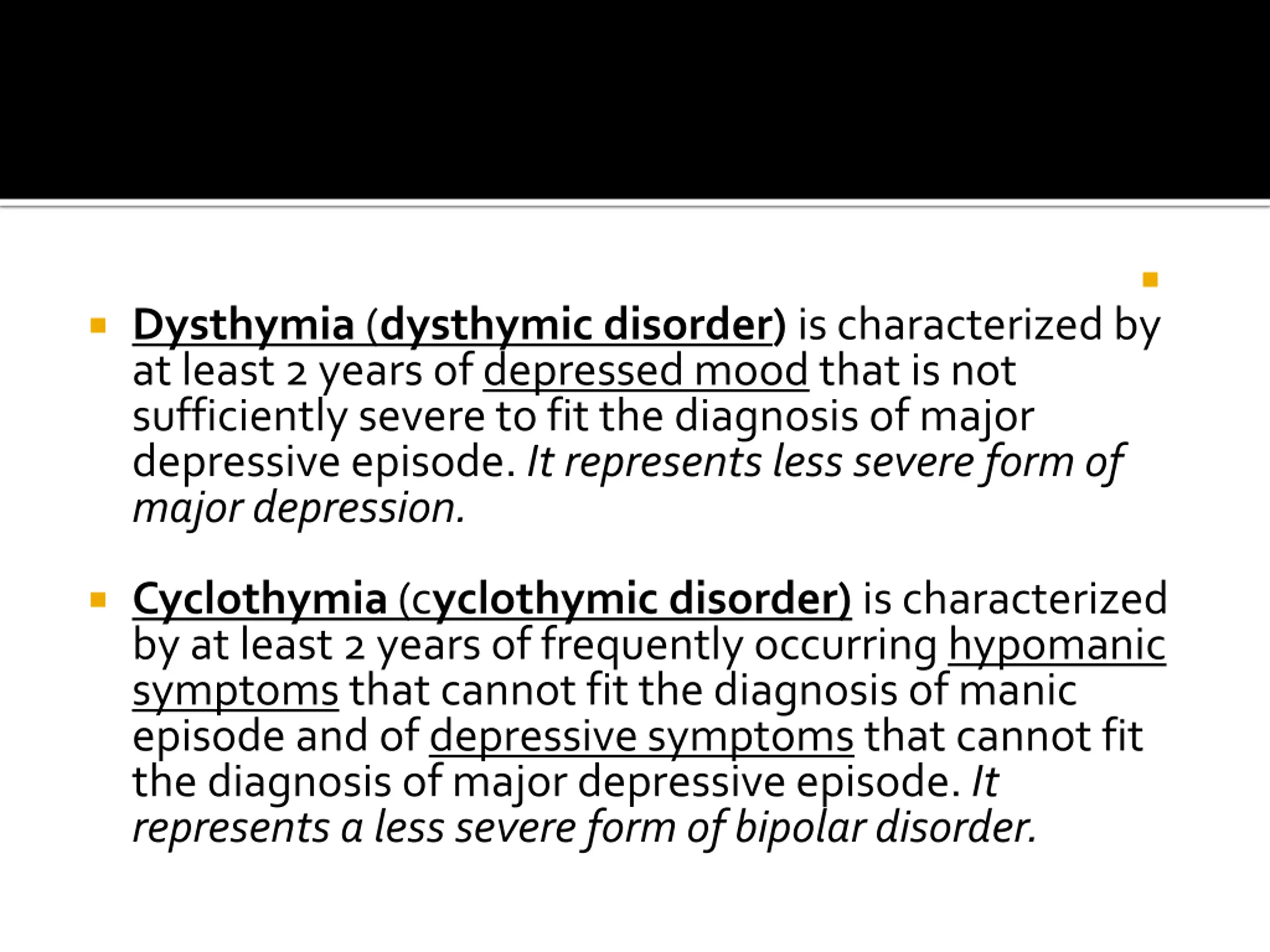 Dysthymia (dysthymic disorder) is characterized by at least 2 years of depressed mood that is not sufficiently severe to fit the diagnosis of major depressive episode. It represents less severe form of major depression. Cyclothymia (cyclothymic disorder) is characterized by at least 2 years of frequently occurring hypomanic symptoms that cannot fit the diagnosis of manic episode and of depressive symptoms that cannot fit the diagnosis of major depressive episode. It represents a less severe form of bipolar disorder.