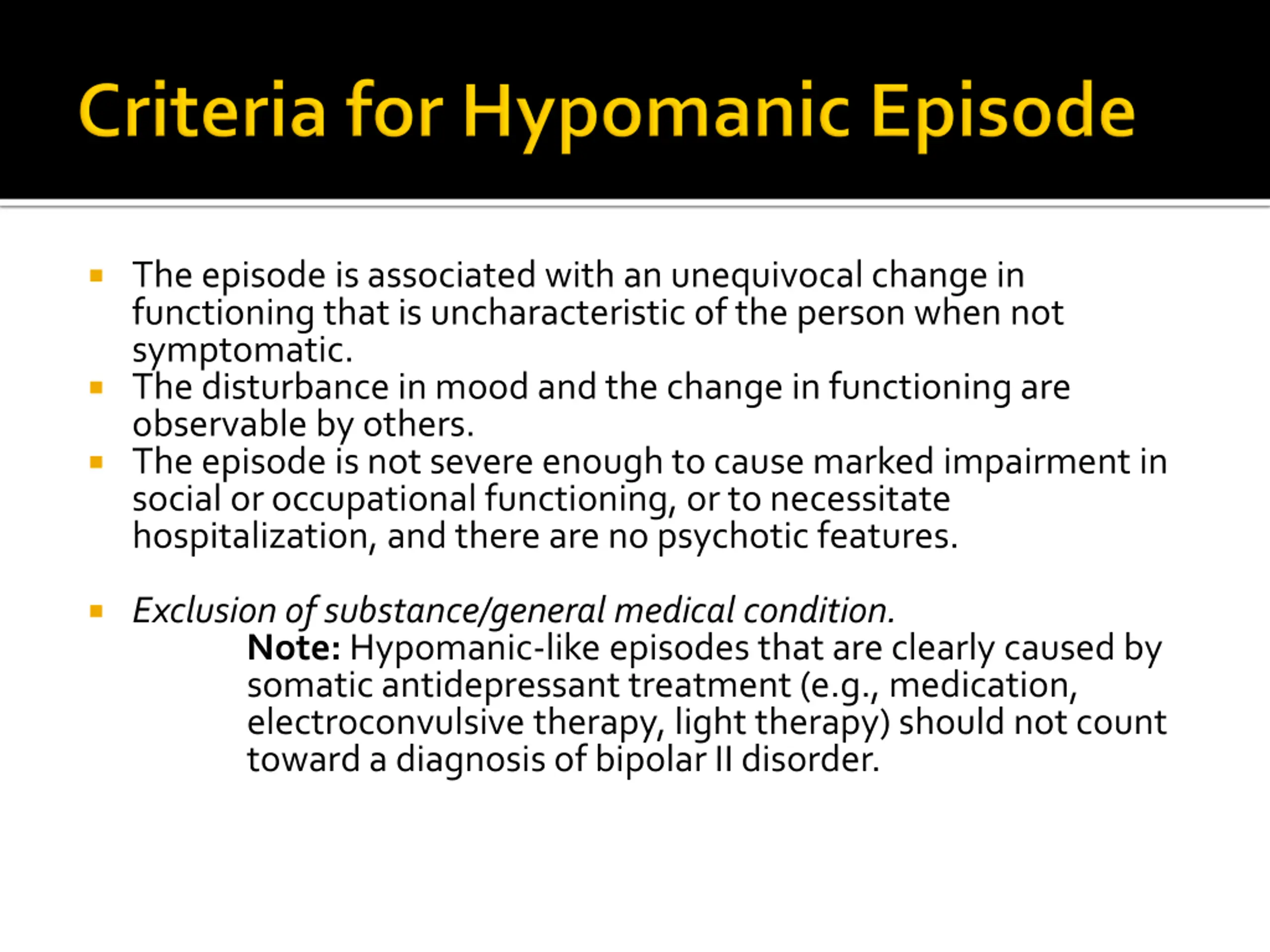 The episode is associated with an unequivocal change in functioning that is uncharacteristic of the person when not symptomatic. The disturbance in mood and the change in functioning are observable by others. The episode is not severe enough to cause marked impairment in social or occupational functioning, or to necessitate hospitalization, and there are no psychotic features. Exclusion of substance/general medical condition. Note: Hypomanic-like episodes that are clearly caused by somatic antidepressant treatment (e.g., medication, electroconvulsive therapy, light therapy) should not count toward a diagnosis of bipolar II disorder.