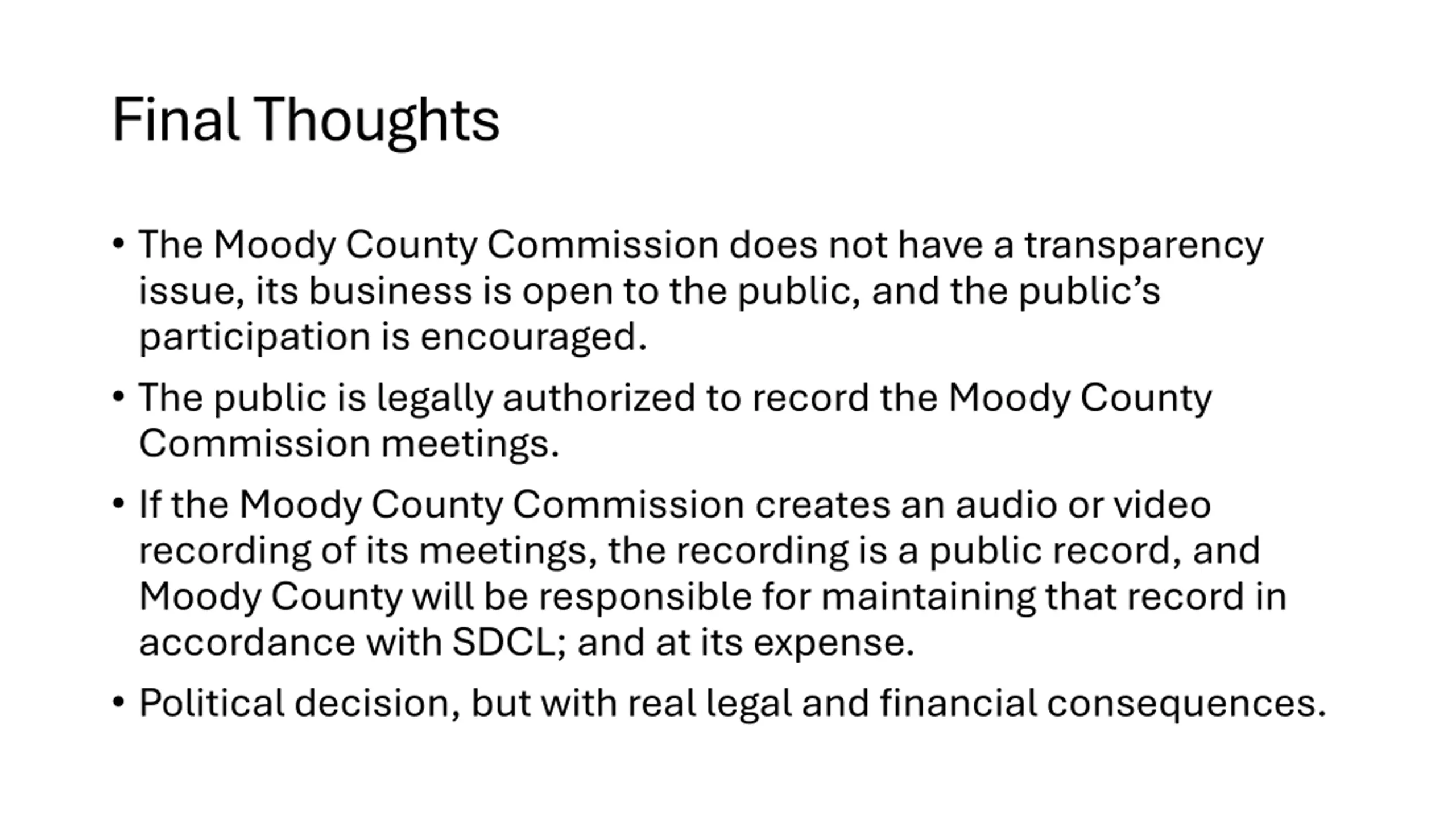 Final Thoughts The Moody County Commission does not have a transparency issue, its business is open to the public, and the public s participation is encouraged. The public is legally authorized to record the Moody County Commission meetings. If the Moody County Commission creates an audio or video recording of its meetings, the recording is a public record, and Moody County will be responsible for maintaining that record in accordance with SDCL; and at its expense. Political decision, but with real legal and financial consequences.