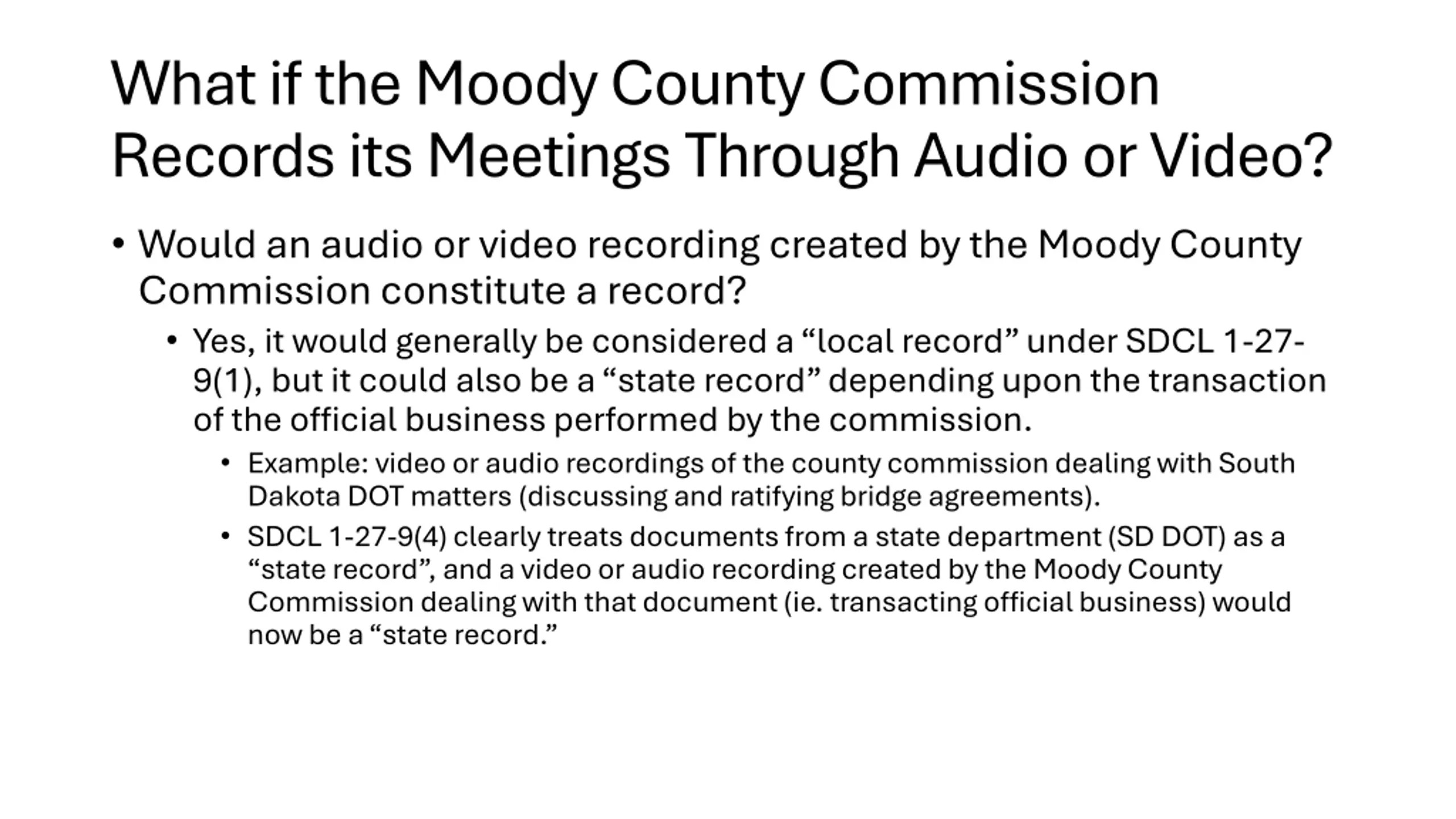 What if the Moody County Commission Records its Meetings Through Audio or Video? Would an audio or video recording created by the Moody County Commission constitute a record? Yes, it would generally be considered a local record under SDCL 1-27- 9(1), but it could also be a state record depending upon the transaction of the official business performed by the commission. Example: video or audio recordings of the county commission dealing with South Dakota DOT matters (discussing and ratifying bridge agreements). SDCL 1-27-9(4) clearly treats documents from a state department (SD DOT) as a state record , and a video or audio recording created by the Moody County Commission dealing with that document (ie. transacting official business) would now be a state record.