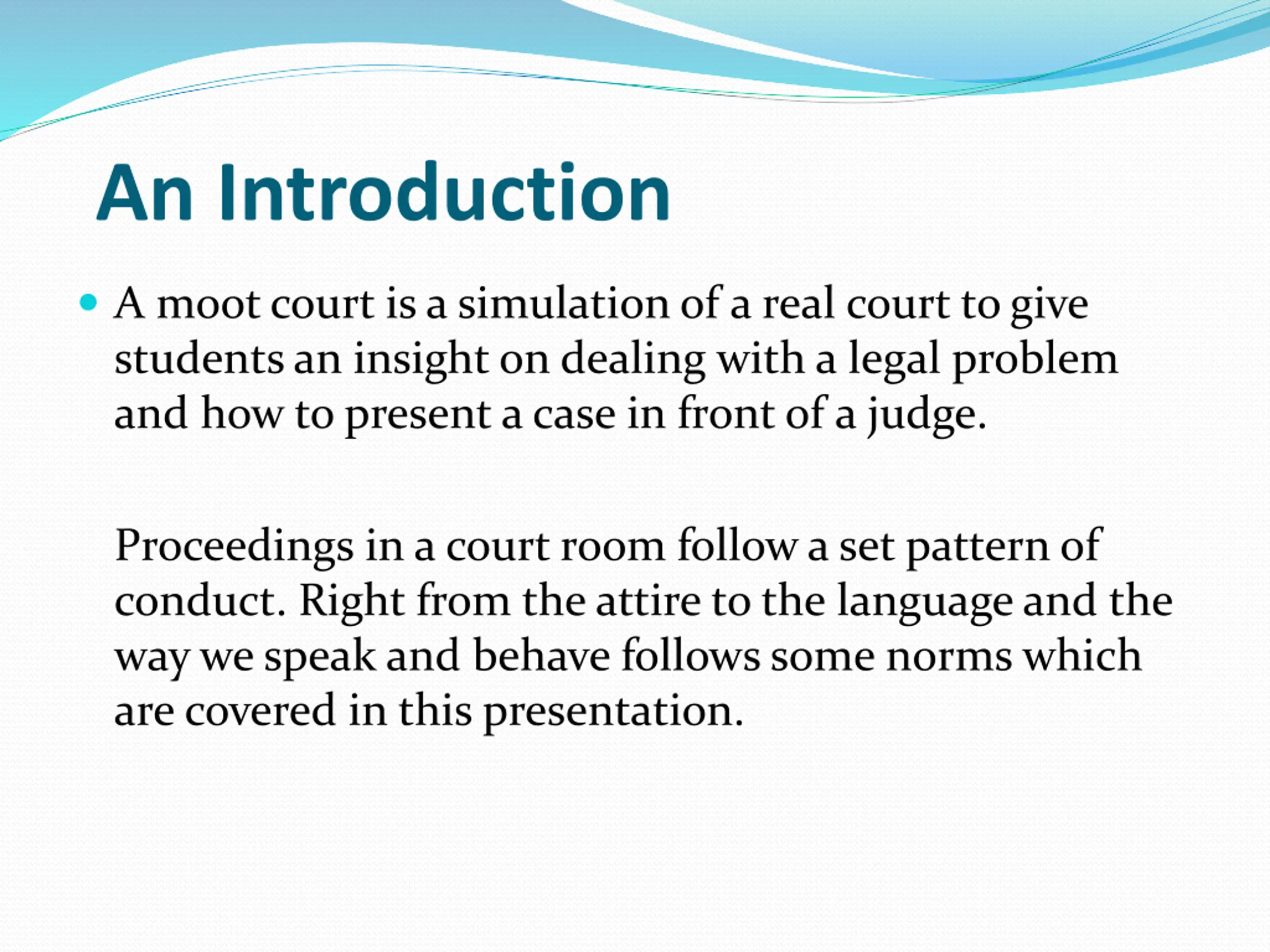 An Introduction A moot court is a simulation of a real court to give students an insight on dealing with a legal problem and how to present a case in front of a judge. Proceedings in a court room follow a set pattern of conduct. Right from the attire to the language and the way we speak and behave follows some norms which are covered in this presentation.