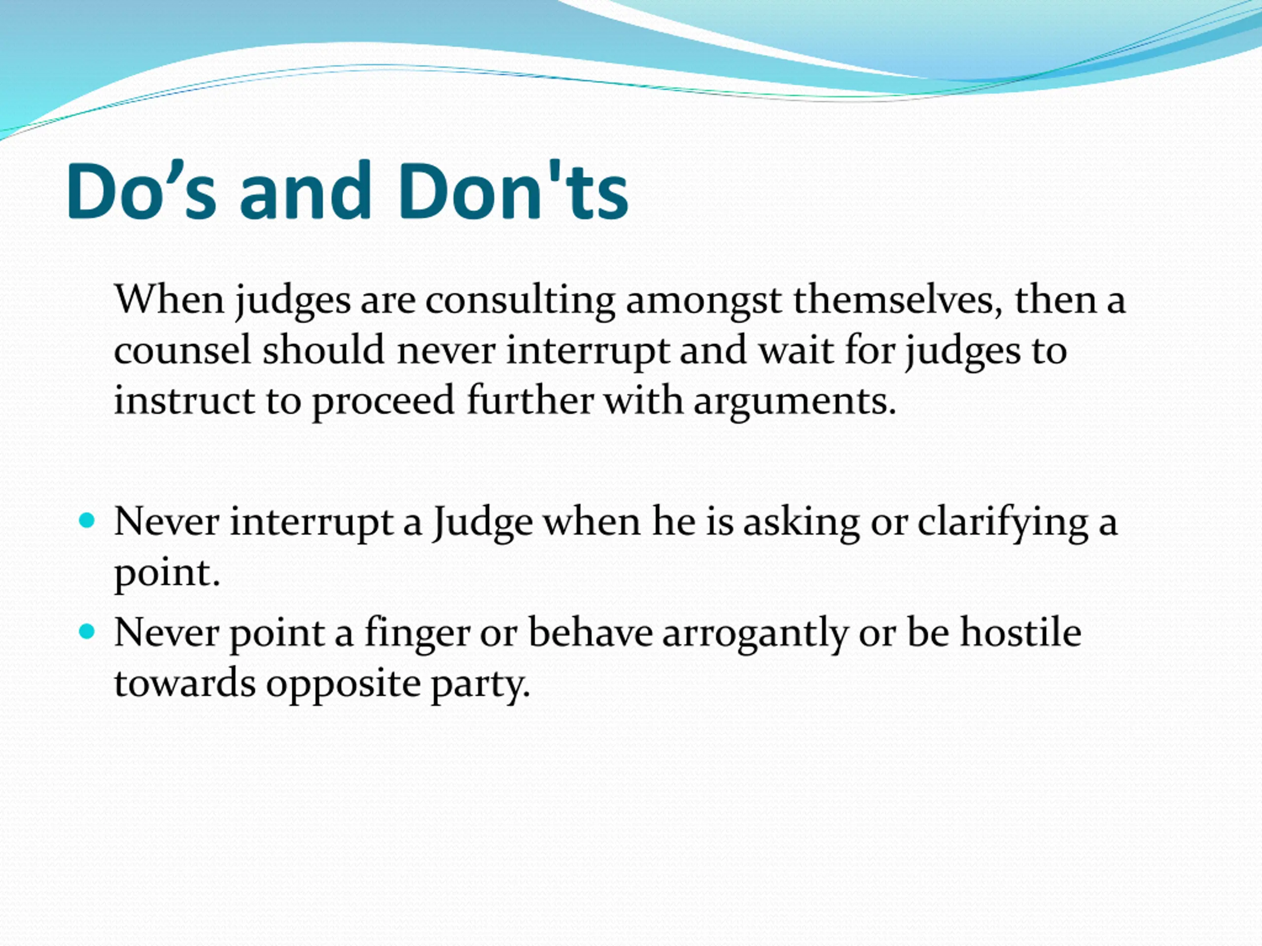 Dos and Don'ts When judges are consulting amongst themselves, then a counsel should never interrupt and wait for judges to instruct to proceed further with arguments. Never interrupt a Judge when he is asking or clarifying a point. Never point a finger or behave arrogantly or be hostile towards opposite party.