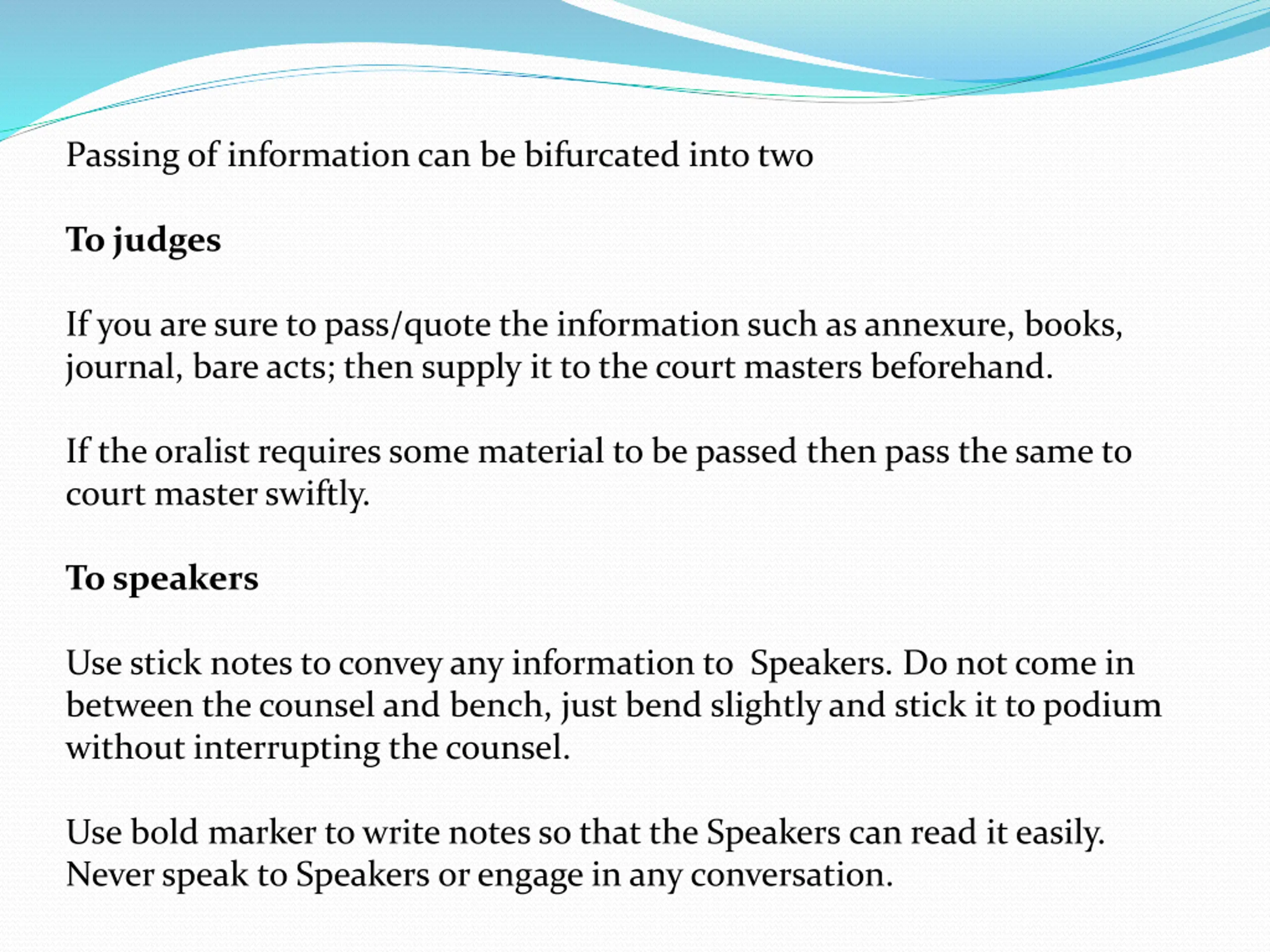 Passing of information can be bifurcated into two To judges If you are sure to pass/quote the information such as annexure, books, journal, bare acts; then supply it to the court masters beforehand. If the oralist requires some material to be passed then pass the same to court master swiftly. To speakers Use stick notes to convey any information to Speakers. Do not come in between the counsel and bench, just bend slightly and stick it to podium without interrupting the counsel. Use bold marker to write notes so that the Speakers can read it easily. Never speak to Speakers or engage in any conversation.