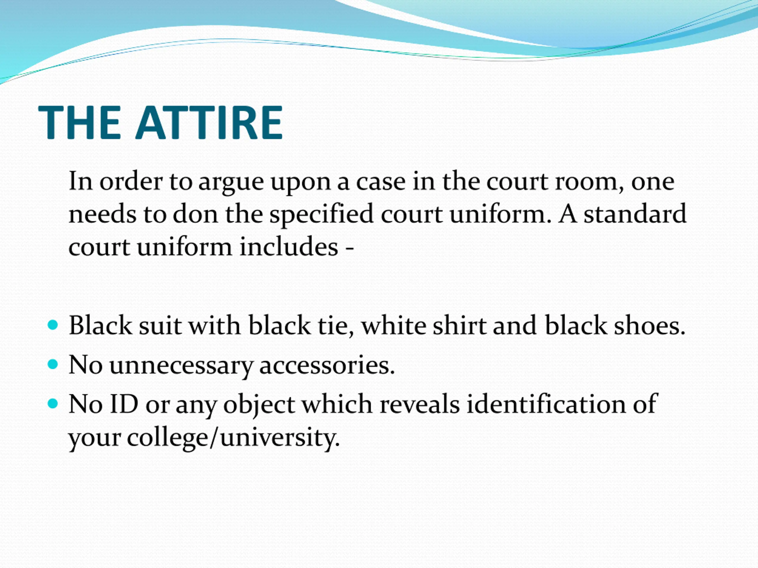 THE ATTIRE In order to argue upon a case in the court room, one needs to don the specified court uniform. A standard court uniform includes - Black suit with black tie, white shirt and black shoes. No unnecessary accessories. No ID or any object which reveals identification of your college/university.
