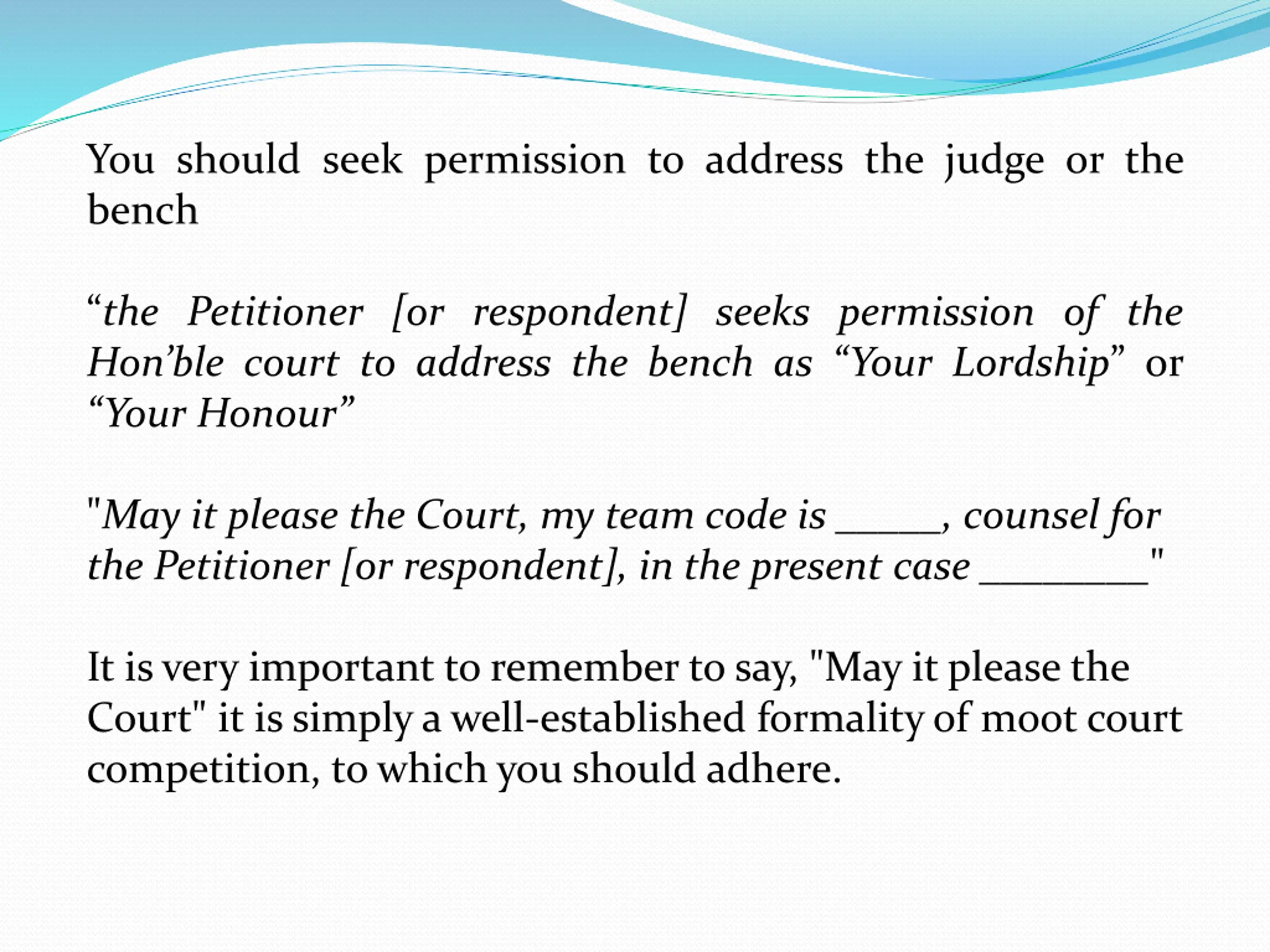You should seek permission to address the judge or the bench the Petitioner [or respondent] seeks permission of the Hon ble court to address the bench as Your Lordship or Your Honour "May it please the Court, my team code is _____, counsel for the Petitioner [or respondent], in the present case ________" It is very important to remember to say, "May it please the Court" it is simply a well-established formality of moot court competition, to which you should adhere.