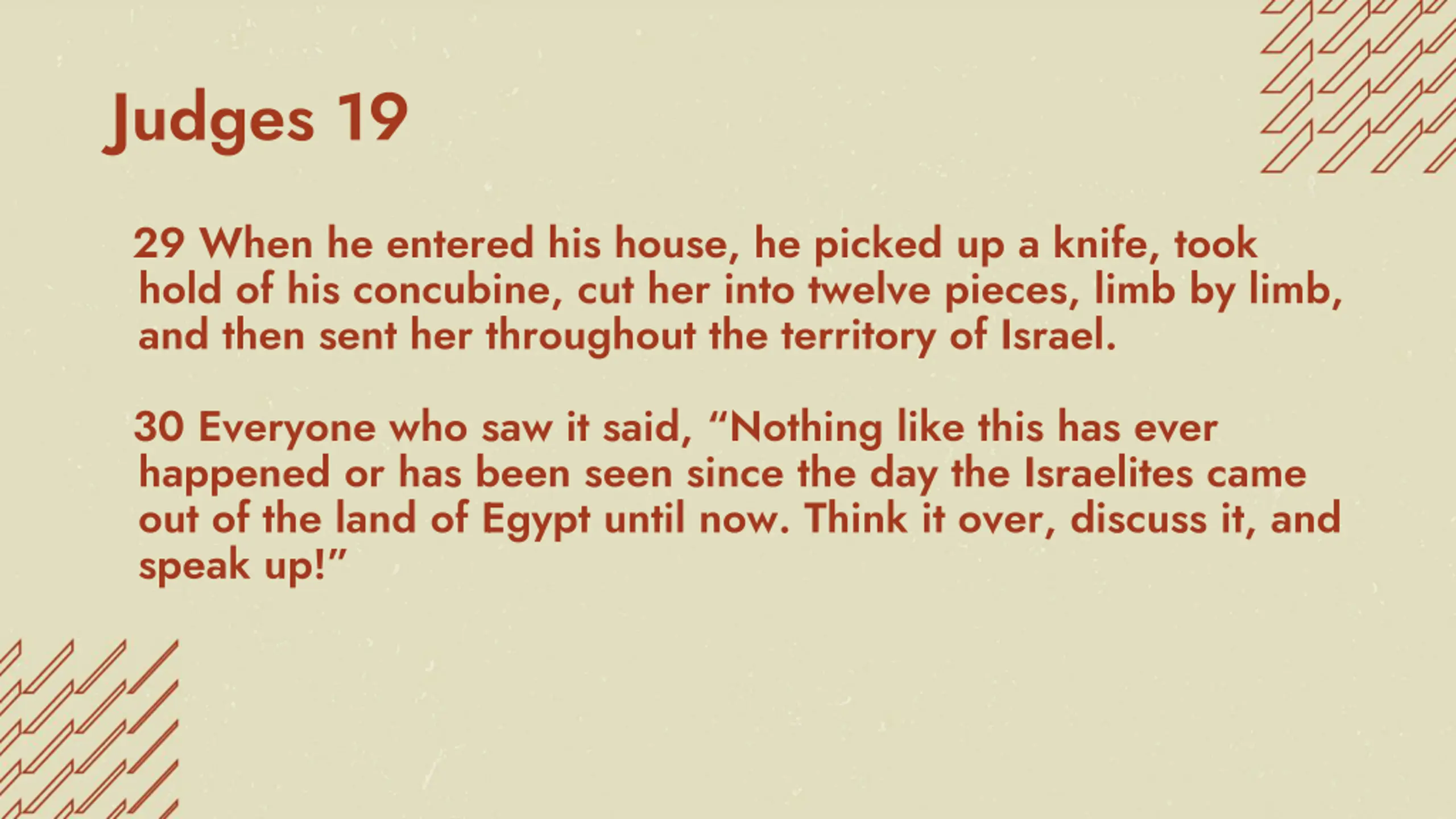 Judges 19 29 When he entered his house, he picked up a knife, took hold of his concubine, cut her into twelve pieces, limb by limb, and then sent her throughout the territory of Israel. 30 Everyone who saw it said, Nothing like this has ever happened or has been seen since the day the Israelites came out of the land of Egypt until now. Think it over, discuss it, and speak up!