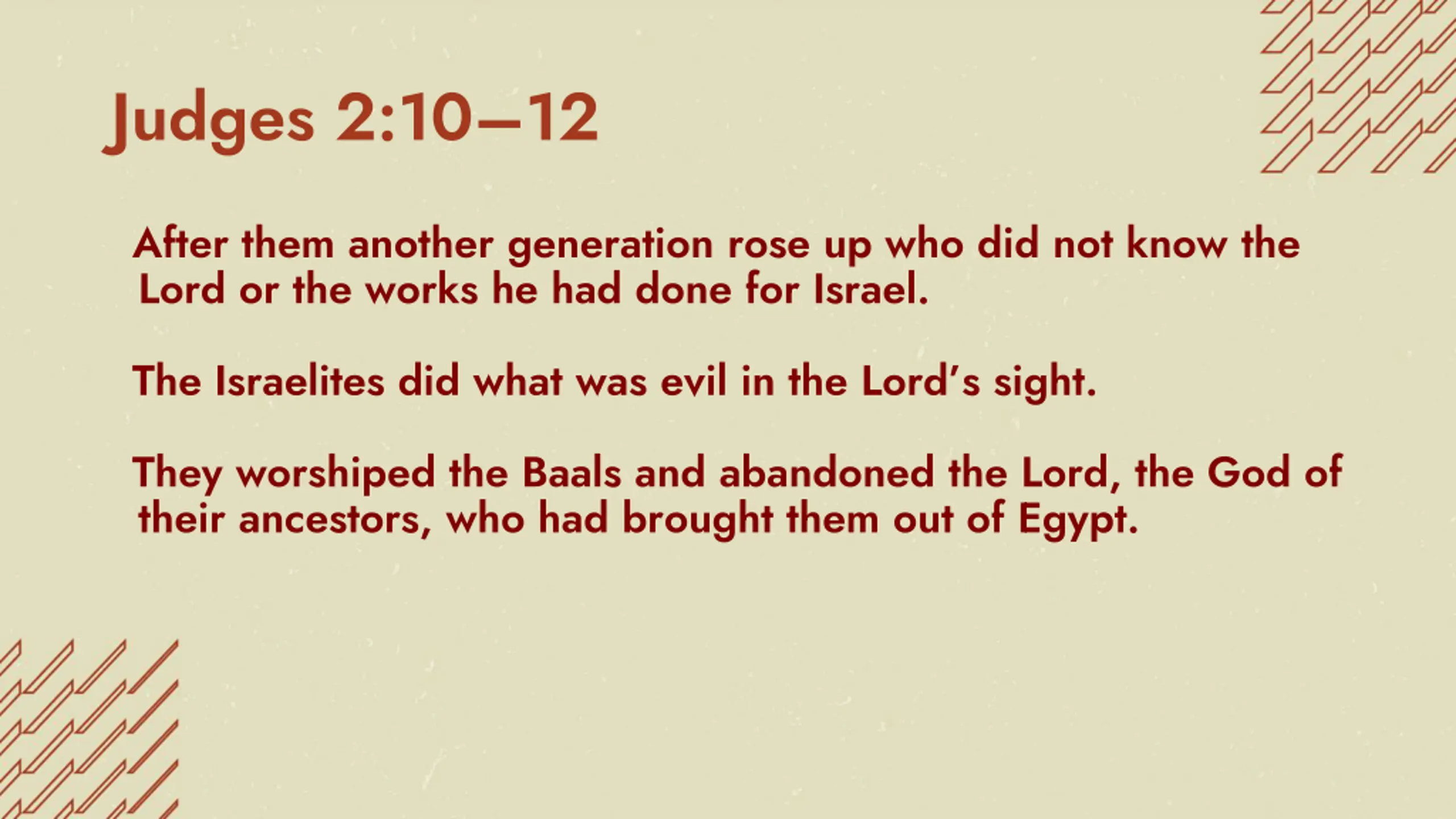Judges 2:1012 After them another generation rose up who did not know the Lord or the works he had done for Israel. The Israelites did what was evil in the Lord s sight. They worshiped the Baals and abandoned the Lord, the God of their ancestors, who had brought them out of Egypt.
