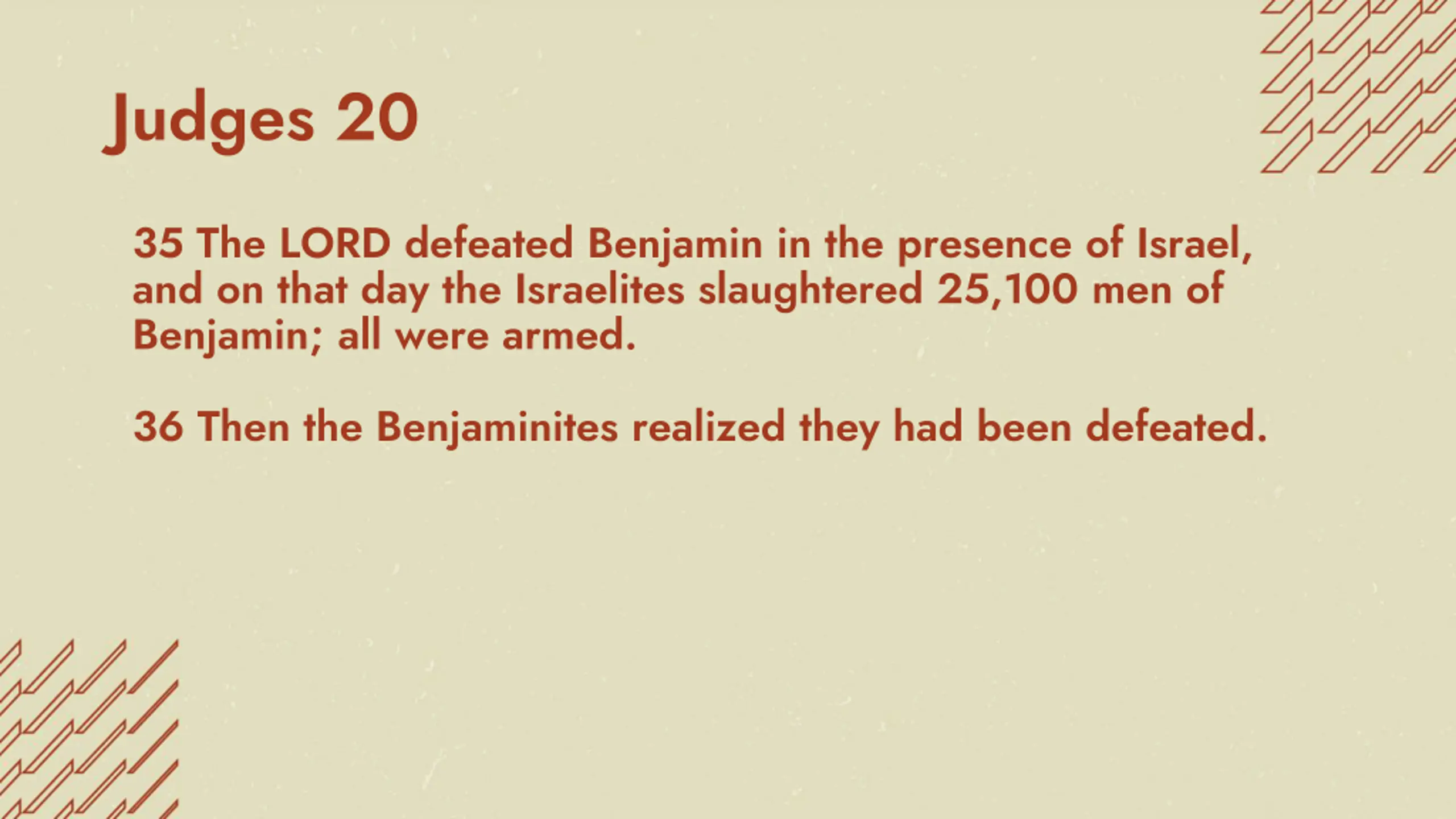 Judges 20 35 The LORD defeated Benjamin in the presence of Israel, and on that day the Israelites slaughtered 25,100 men of Benjamin; all were armed. 36 Then the Benjaminites realized they had been defeated.