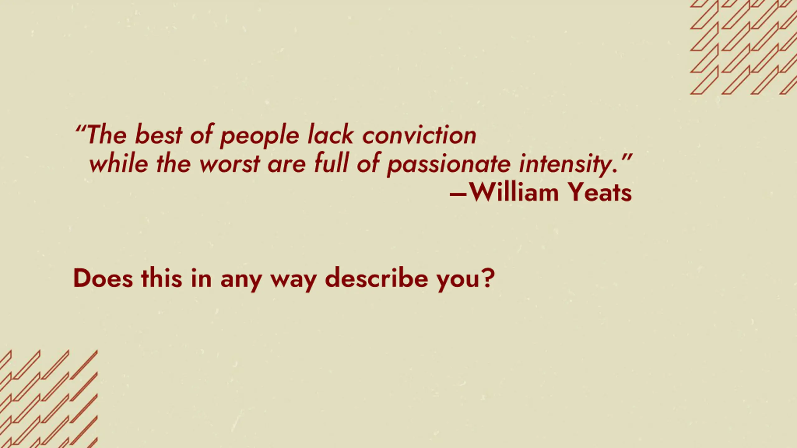 The best of people lack conviction while the worst are full of passionate intensity. William Yeats Does this in any way describe you?