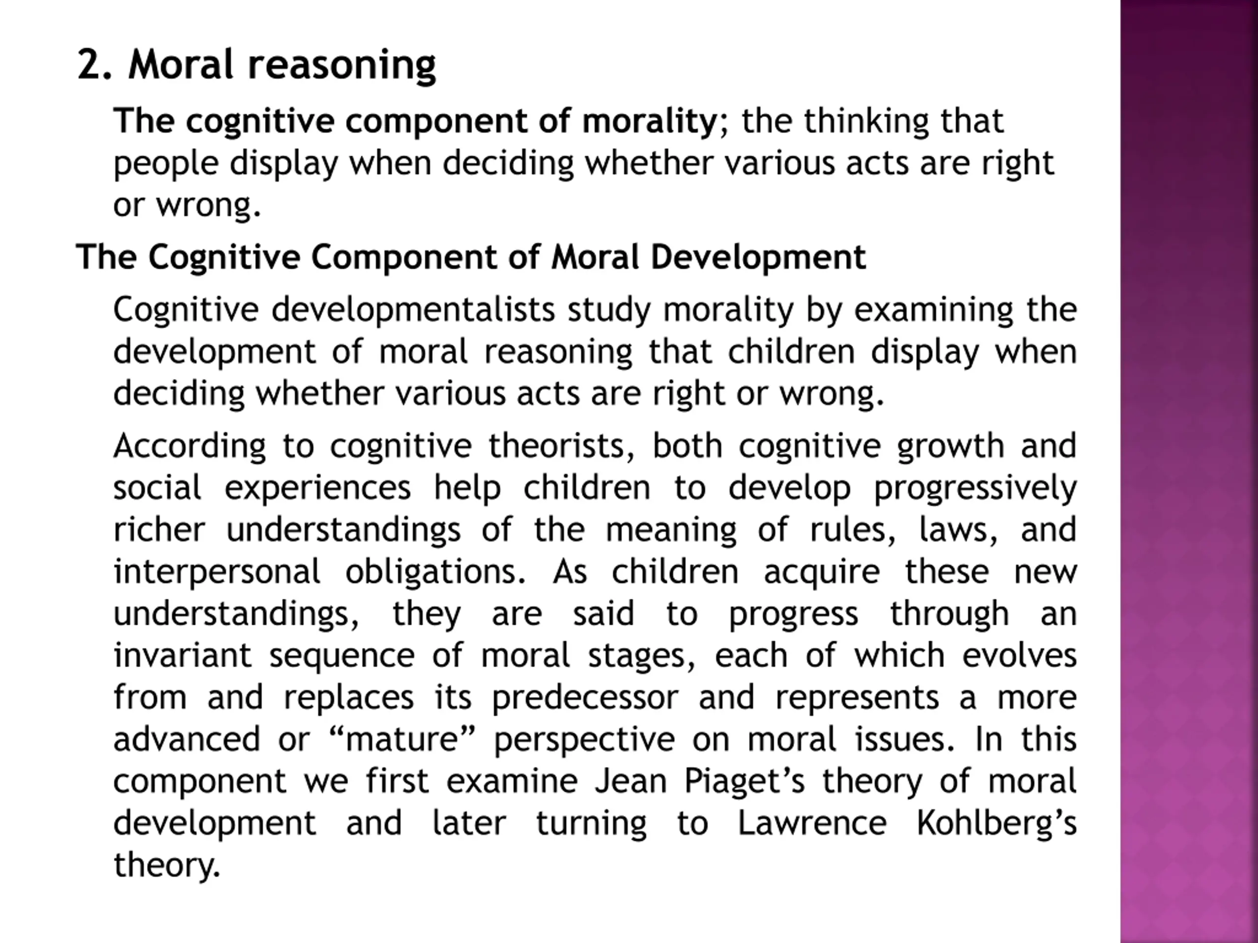 2. Moral reasoning The cognitive component of morality; the thinking that people display when deciding whether various acts are right or wrong. The Cognitive Component of Moral Development Cognitive developmentalists study morality by examining the development of moral reasoning that children display when deciding whether various acts are right or wrong. According to cognitive theorists, both cognitive growth and social experiences help children to develop progressively richer understandings of the meaning of rules, laws, and interpersonal obligations. As children acquire these new understandings, they are said to progress through an invariant sequence of moral stages, each of which evolves from and replaces its predecessor and represents a more advanced or mature perspective on moral issues. In this component we first examine Jean Piaget s theory of moral development and later turning to Lawrence Kohlberg s theory.