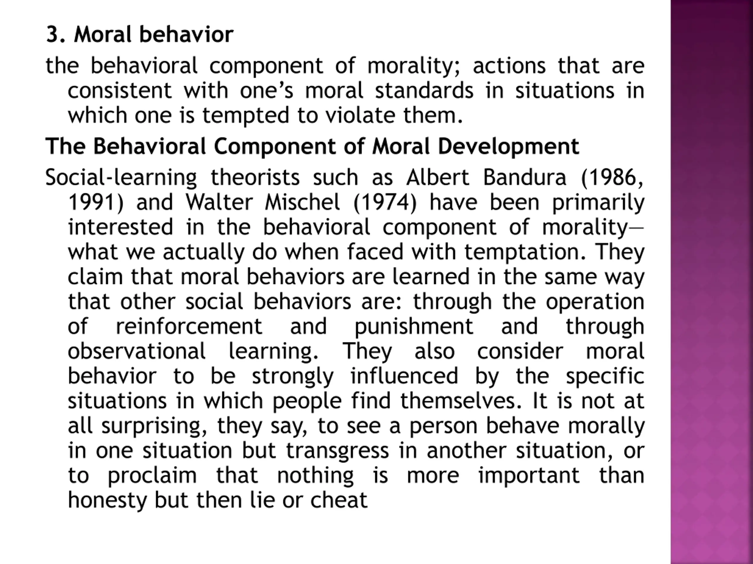 3. Moral behavior the behavioral component of morality; actions that are consistent with one s moral standards in situations in which one is tempted to violate them. The Behavioral Component of Moral Development Social-learning theorists such as Albert Bandura (1986, 1991) and Walter Mischel (1974) have been primarily interested in the behavioral component of morality what we actually do when faced with temptation. They claim that moral behaviors are learned in the same way that other social behaviors are: through the operation of reinforcement and punishment and through observational learning. They also consider moral behavior to be strongly influenced by the specific situations in which people find themselves. It is not at all surprising, they say, to see a person behave morally in one situation but transgress in another situation, or to proclaim that nothing is more important than honesty but then lie or cheat