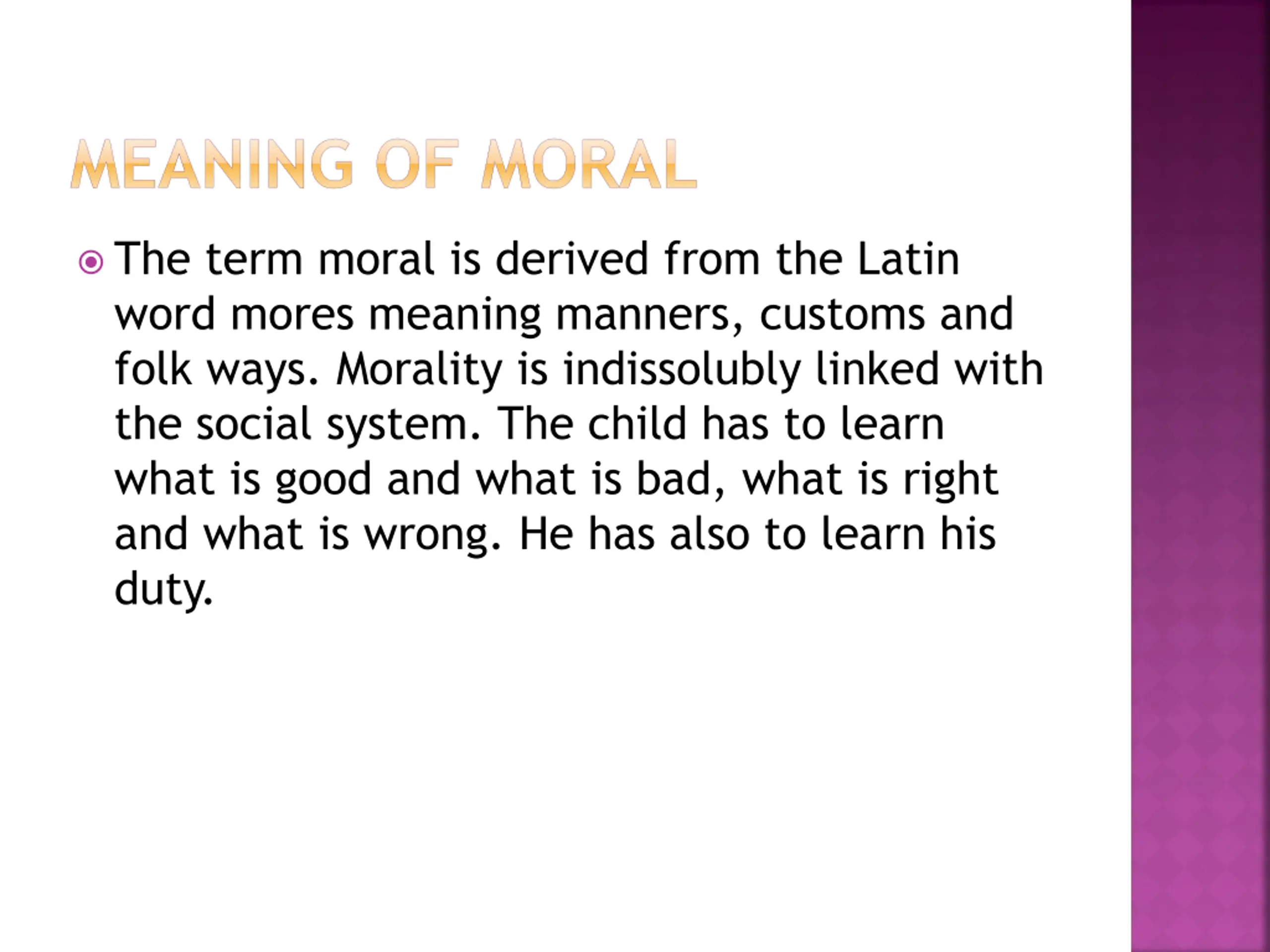 MEANING OF MORAL The term moral is derived from the Latin word mores meaning manners, customs and folk ways. Morality is indissolubly linked with the social system. The child has to learn what is good and what is bad, what is right and what is wrong. He has also to learn his duty.