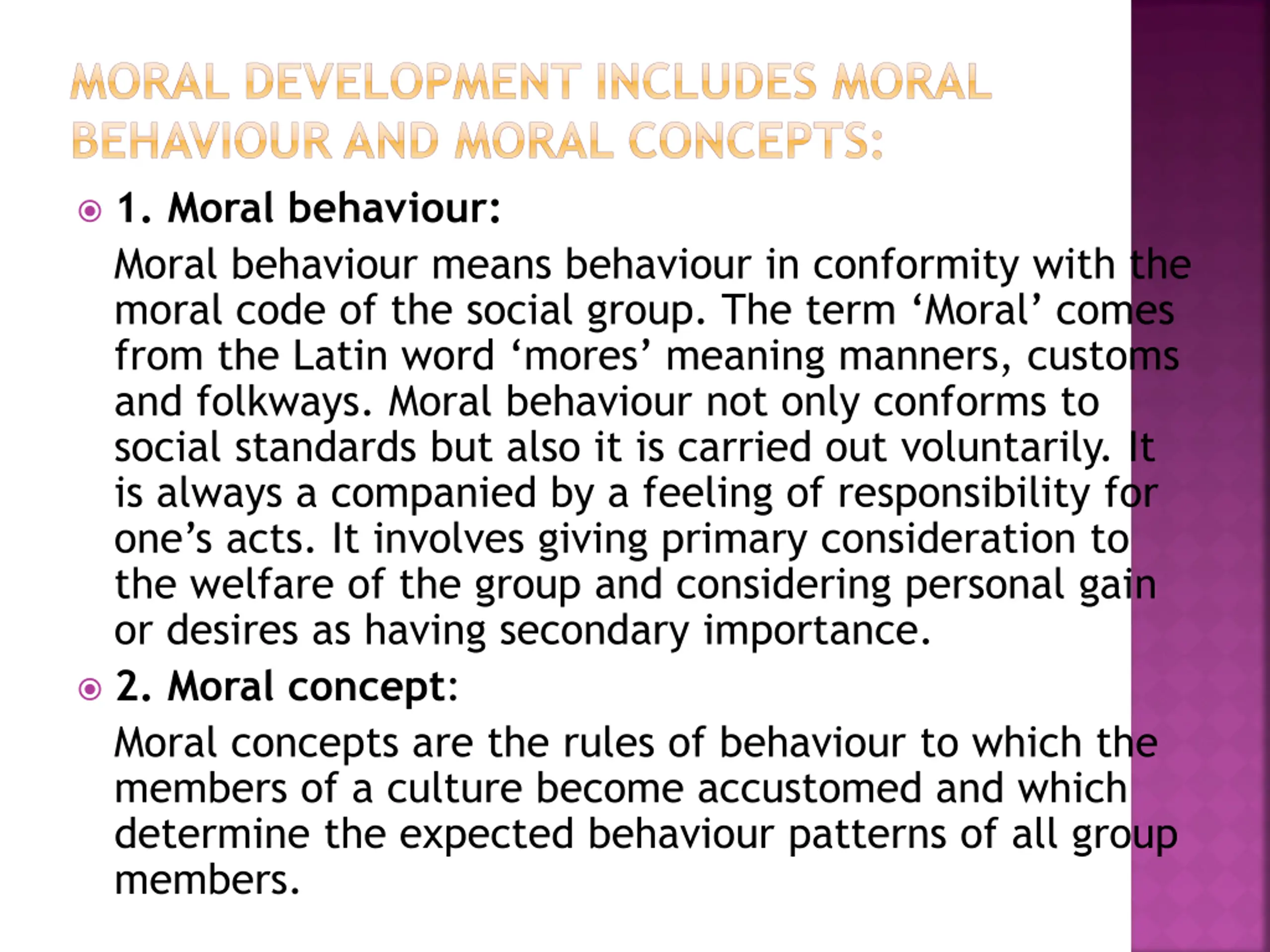 MORAL DEVELOPMENT INCLUDES MORAL BEHAVIOUR AND MORAL CONCEPTS: 1. Moral behaviour: Moral behaviour means behaviour in conformity with the moral code of the social group. The term Moral comes from the Latin word mores meaning manners, customs and folkways. Moral behaviour not only conforms to social standards but also it is carried out voluntarily. It is always a companied by a feeling of responsibility for one s acts. It involves giving primary consideration to the welfare of the group and considering personal gain or desires as having secondary importance. 2. Moral concept: Moral concepts are the rules of behaviour to which the members of a culture become accustomed and which determine the expected behaviour patterns of all group members.