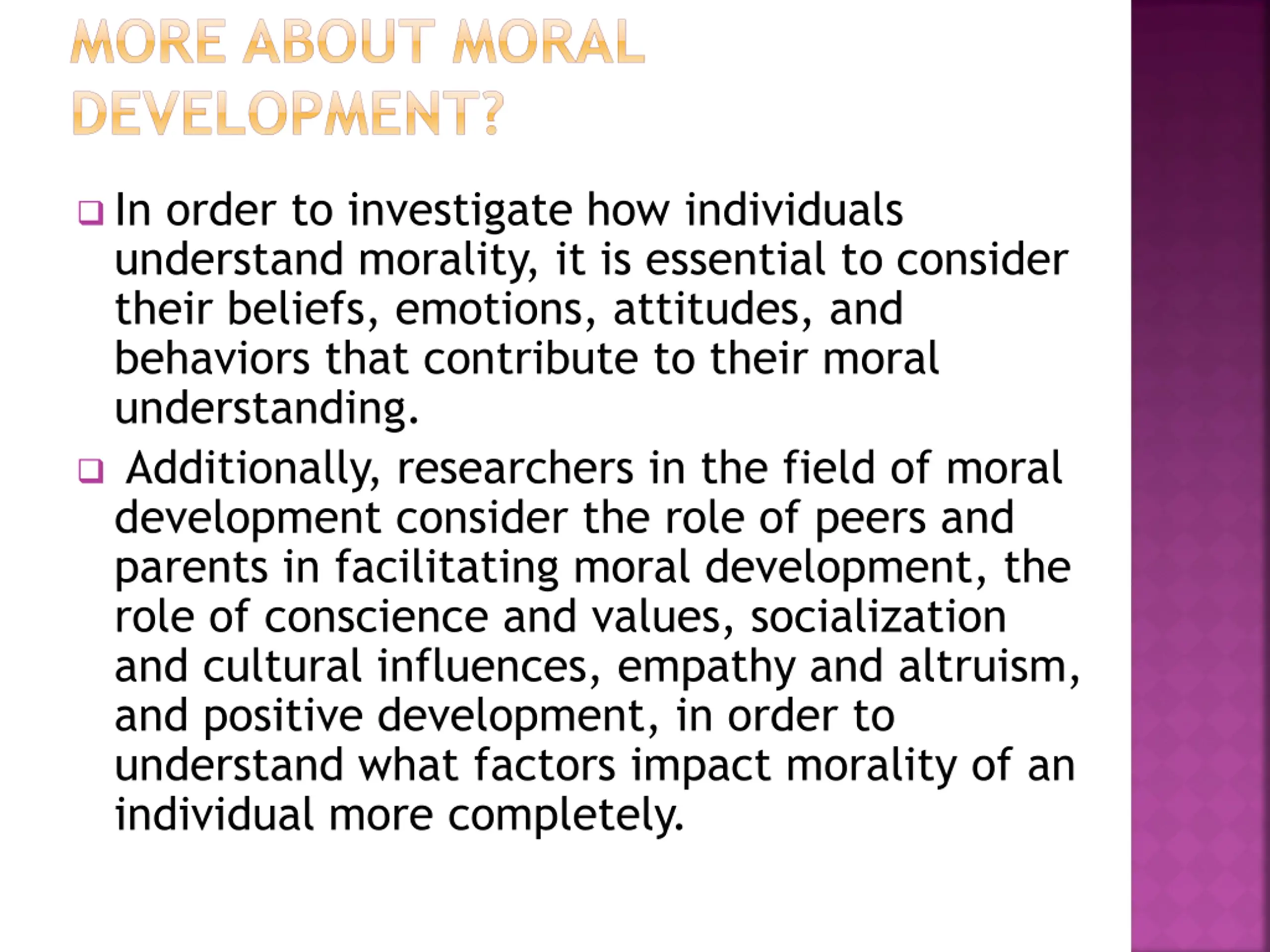 MORE ABOUT MORAL DEVELOPMENT? In order to investigate how individuals understand morality, it is essential to consider their beliefs, emotions, attitudes, and behaviors that contribute to their moral understanding. Additionally, researchers in the field of moral development consider the role of peers and parents in facilitating moral development, the role of conscience and values, socialization and cultural influences, empathy and altruism, and positive development, in order to understand what factors impact morality of an individual more completely.