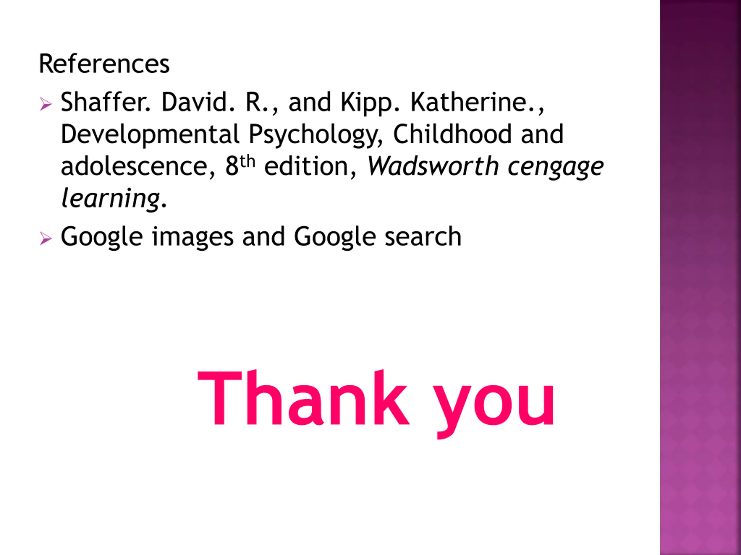 References Shaffer. David. R., and Kipp. Katherine., Developmental Psychology, Childhood and adolescence, 8th edition, Wadsworth cengage learning. Google images and Google search Thank you