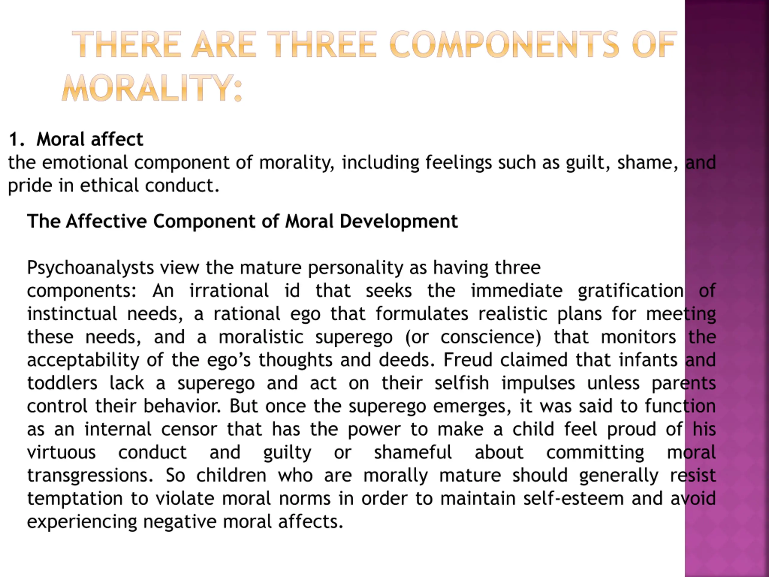THERE ARE THREE COMPONENTS OF MORALITY: 1. Moral affect the emotional component of morality, including feelings such as guilt, shame, and pride in ethical conduct. The Affective Component of Moral Development Psychoanalysts view the mature personality as having three components: An irrational id that seeks the immediate gratification of instinctual needs, a rational ego that formulates realistic plans for meeting these needs, and a moralistic superego (or conscience) that monitors the acceptability of the ego s thoughts and deeds. Freud claimed that infants and toddlers lack a superego and act on their selfish impulses unless parents control their behavior. But once the superego emerges, it was said to function as an internal censor that has the power to make a child feel proud of his virtuous conduct and guilty or shameful about committing moral transgressions. So children who are morally mature should generally resist temptation to violate moral norms in order to maintain self-esteem and avoid experiencing negative moral affects.