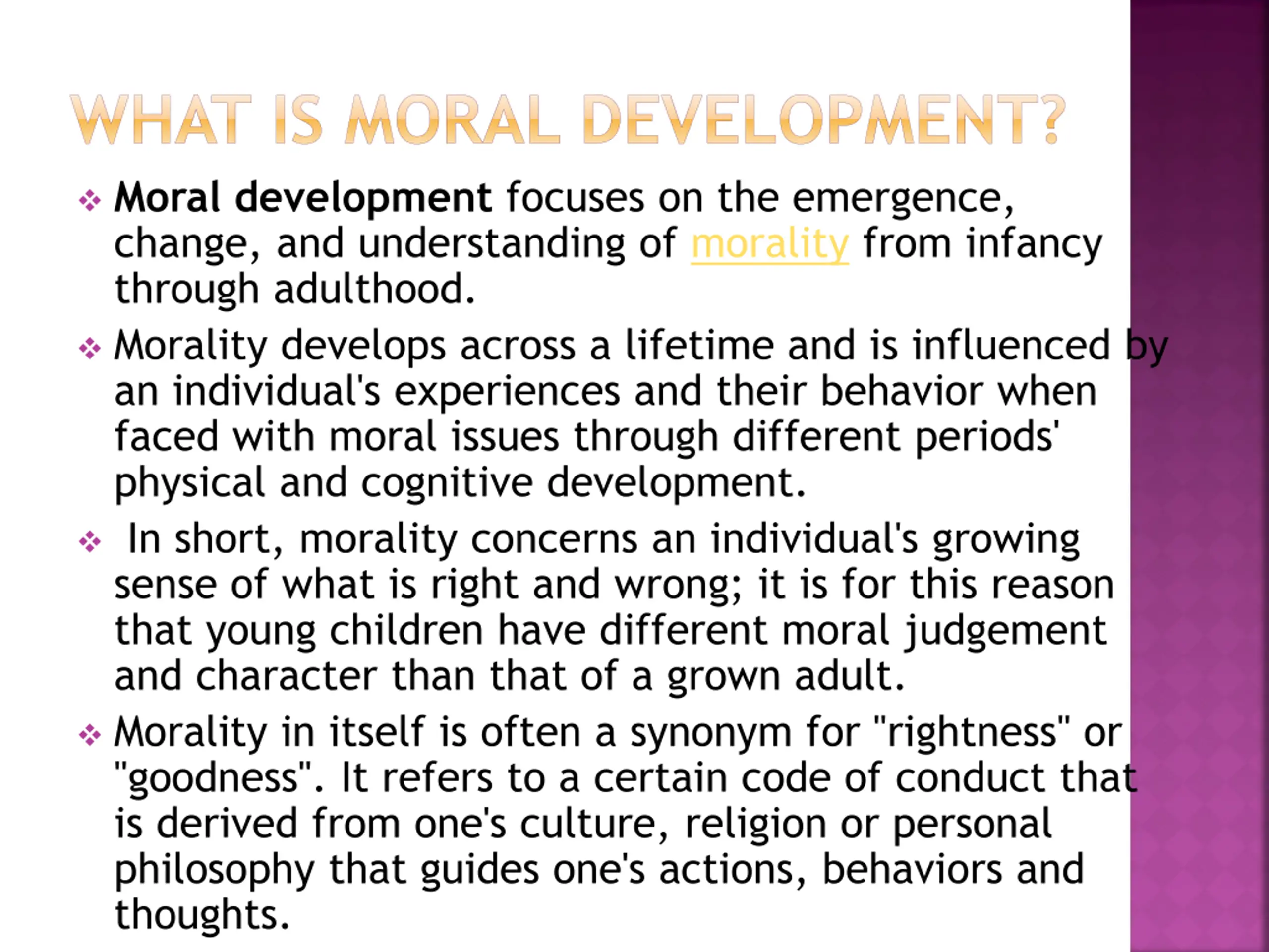 WHAT IS MORAL DEVELOPMENT? Moral development focuses on the emergence, change, and understanding of morality from infancy through adulthood. Morality develops across a lifetime and is influenced by an individual's experiences and their behavior when faced with moral issues through different periods' physical and cognitive development. In short, morality concerns an individual's growing sense of what is right and wrong; it is for this reason that young children have different moral judgement and character than that of a grown adult. Morality in itself is often a synonym for "rightness" or "goodness". It refers to a certain code of conduct that is derived from one's culture, religion or personal philosophy that guides one's actions, behaviors and thoughts.