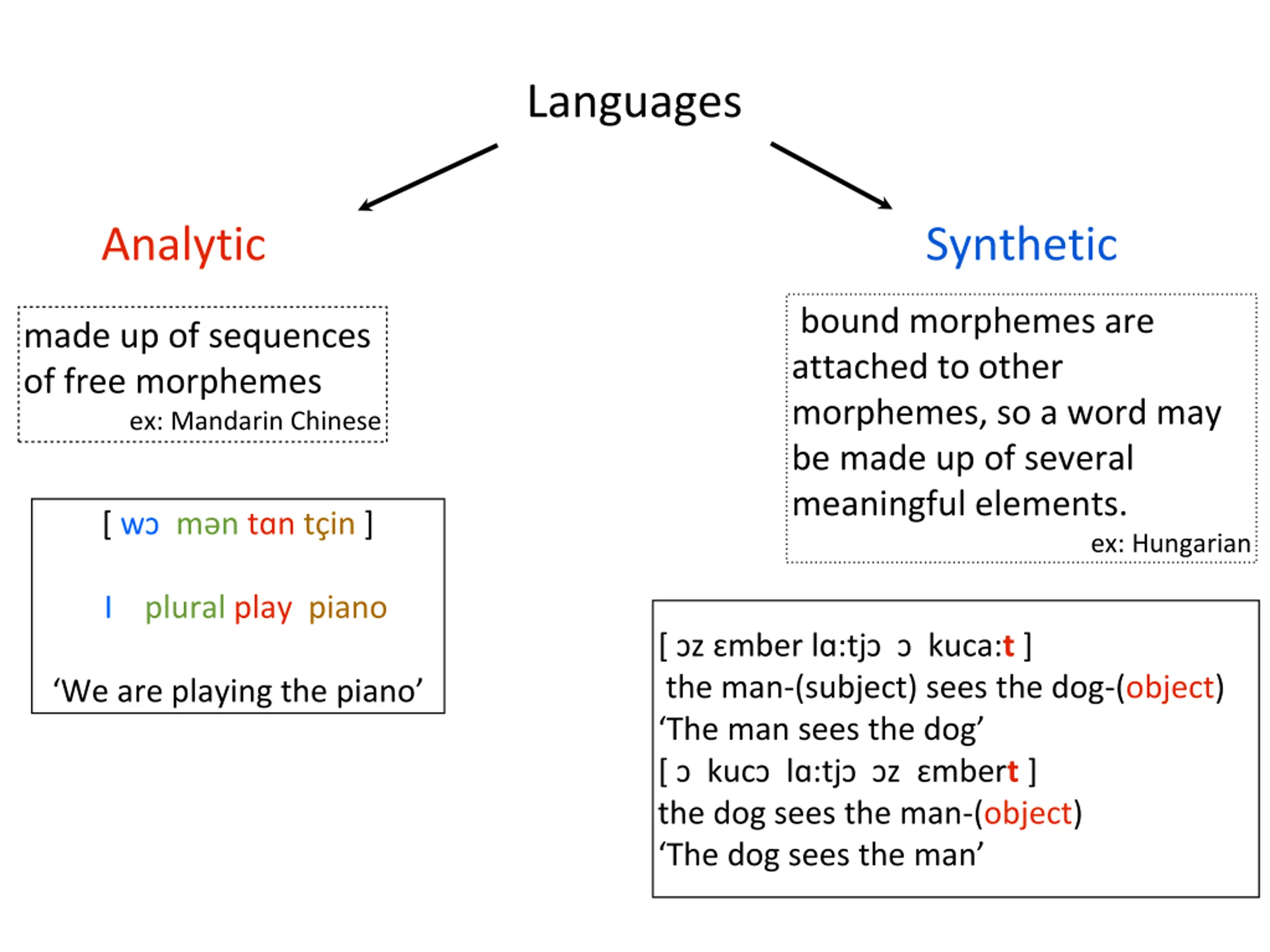 Languages Analytic Synthetic bound morphemes are attached to other morphemes, so a word may be made up of several meaningful elements. made up of sequences of free morphemes ex: Mandarin Chinese [ w m nt n t in ] ex: Hungarian I plural play piano [ z mber l :tj kuca:t ] the man-(subject) sees the dog-(object) The man sees the dog [ kuc l :tj z mbert ] the dog sees the man-(object) The dog sees the man We are playing the piano