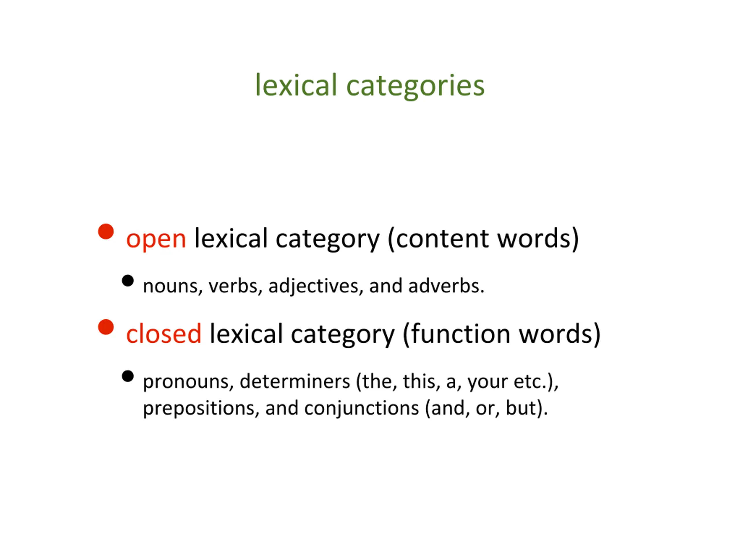 lexical categories open lexical category (content words) nouns, verbs, adjectives, and adverbs. closed lexical category (function words) pronouns, determiners (the, this, a, your etc.), prepositions, and conjunctions (and, or, but).