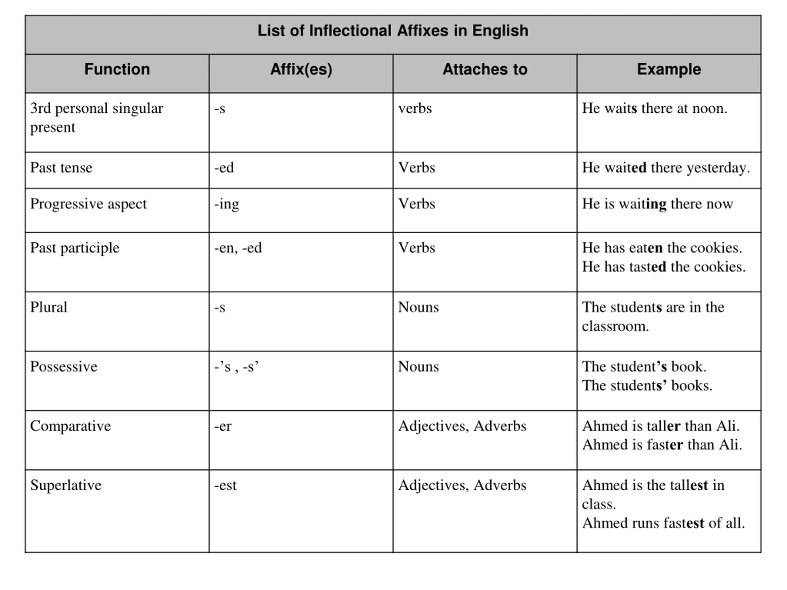 List of Inflectional Affixes in English Function Affix(es) Attaches to Example 3rd personal singular present -s verbs He waits there at noon. Past tense -ed Verbs He waited there yesterday. Progressive aspect -ing Verbs He is waiting there now Past participle -en, -ed Verbs He has eaten the cookies. He has tasted the cookies. Plural -s Nouns The students are in the classroom. Possessive - s , -s Nouns The student s book. The students books. Comparative -er Adjectives, Adverbs Ahmed is taller than Ali. Ahmed is faster than Ali. Superlative -est Adjectives, Adverbs Ahmed is the tallest in class. Ahmed runs fastest of all.
