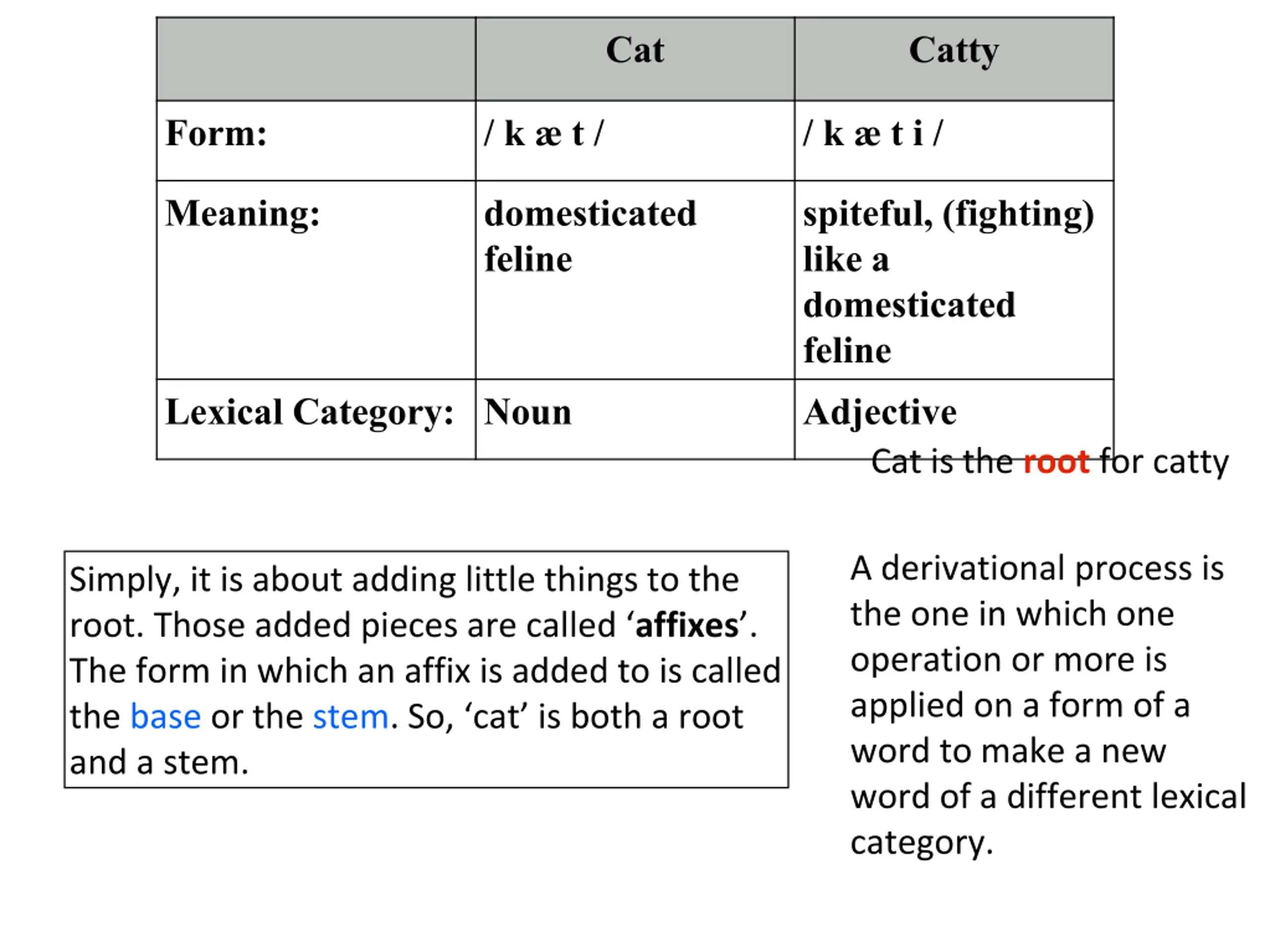 Cat Catty Form: / k t / / k t i / Meaning: domesticated feline spiteful, (fighting) like a domesticated feline Lexical Category: Noun Adjective Cat is the root for catty A derivational process is the one in which one operation or more is applied on a form of a word to make a new word of a different lexical category. Simply, it is about adding little things to the root. Those added pieces are called affixes . The form in which an affix is added to is called the base or the stem. So, cat is both a root and a stem.