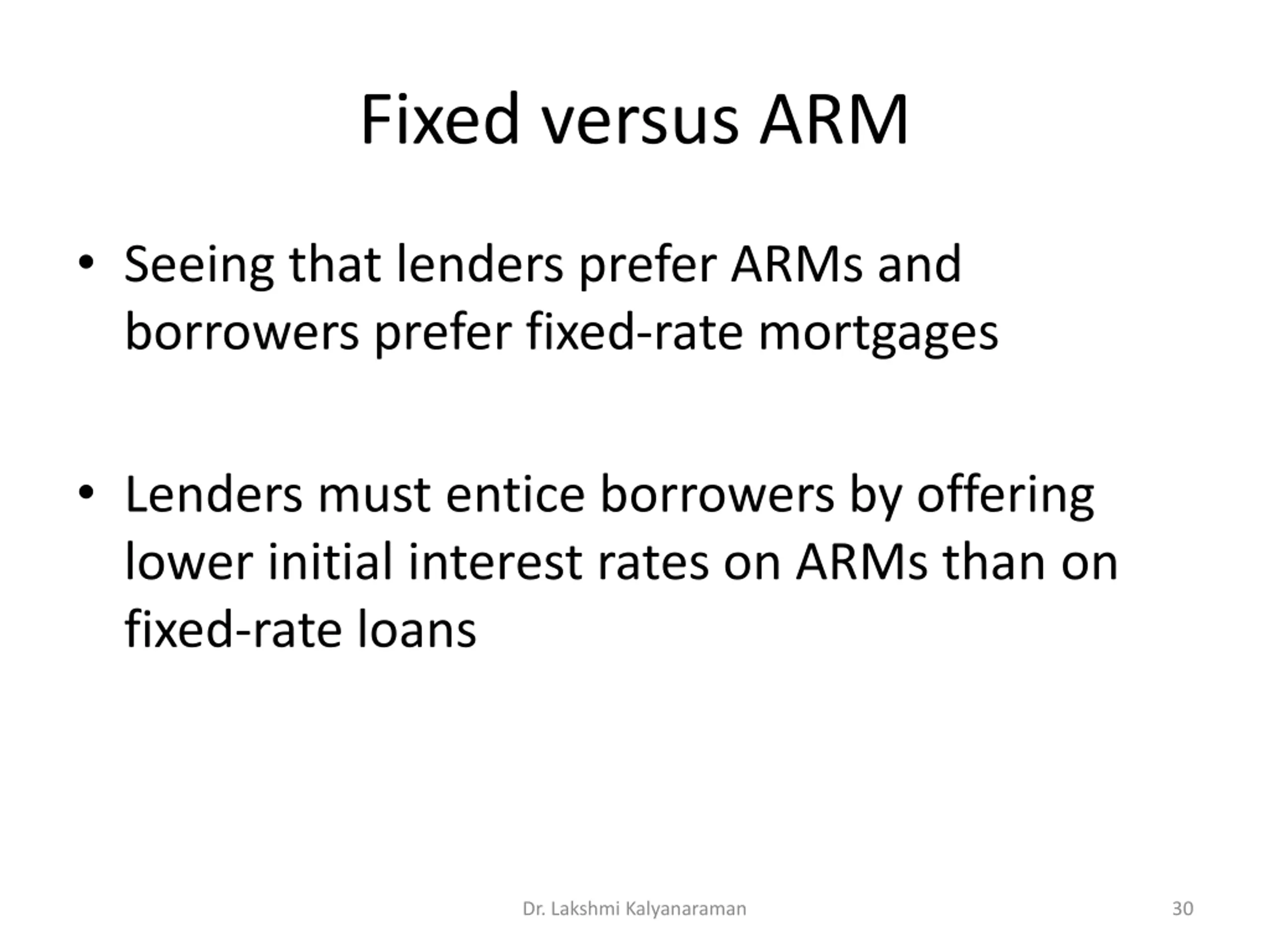 Fixed versus ARM Seeing that lenders prefer ARMs and borrowers prefer fixed-rate mortgages Lenders must entice borrowers by offering lower initial interest rates on ARMs than on fixed-rate loans Dr. Lakshmi Kalyanaraman 30
