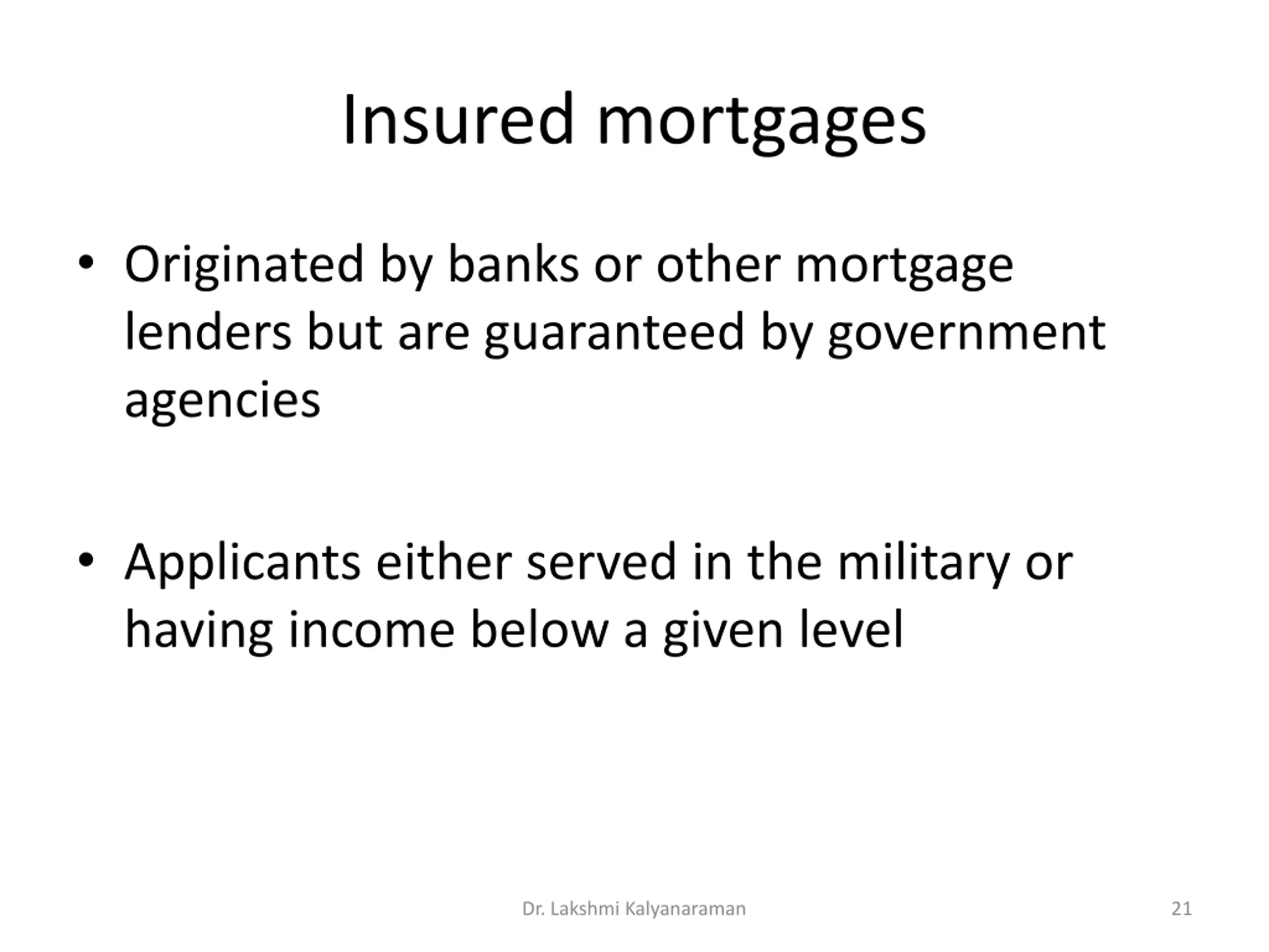 Insured mortgages Originated by banks or other mortgage lenders but are guaranteed by government agencies Applicants either served in the military or having income below a given level Dr. Lakshmi Kalyanaraman 21