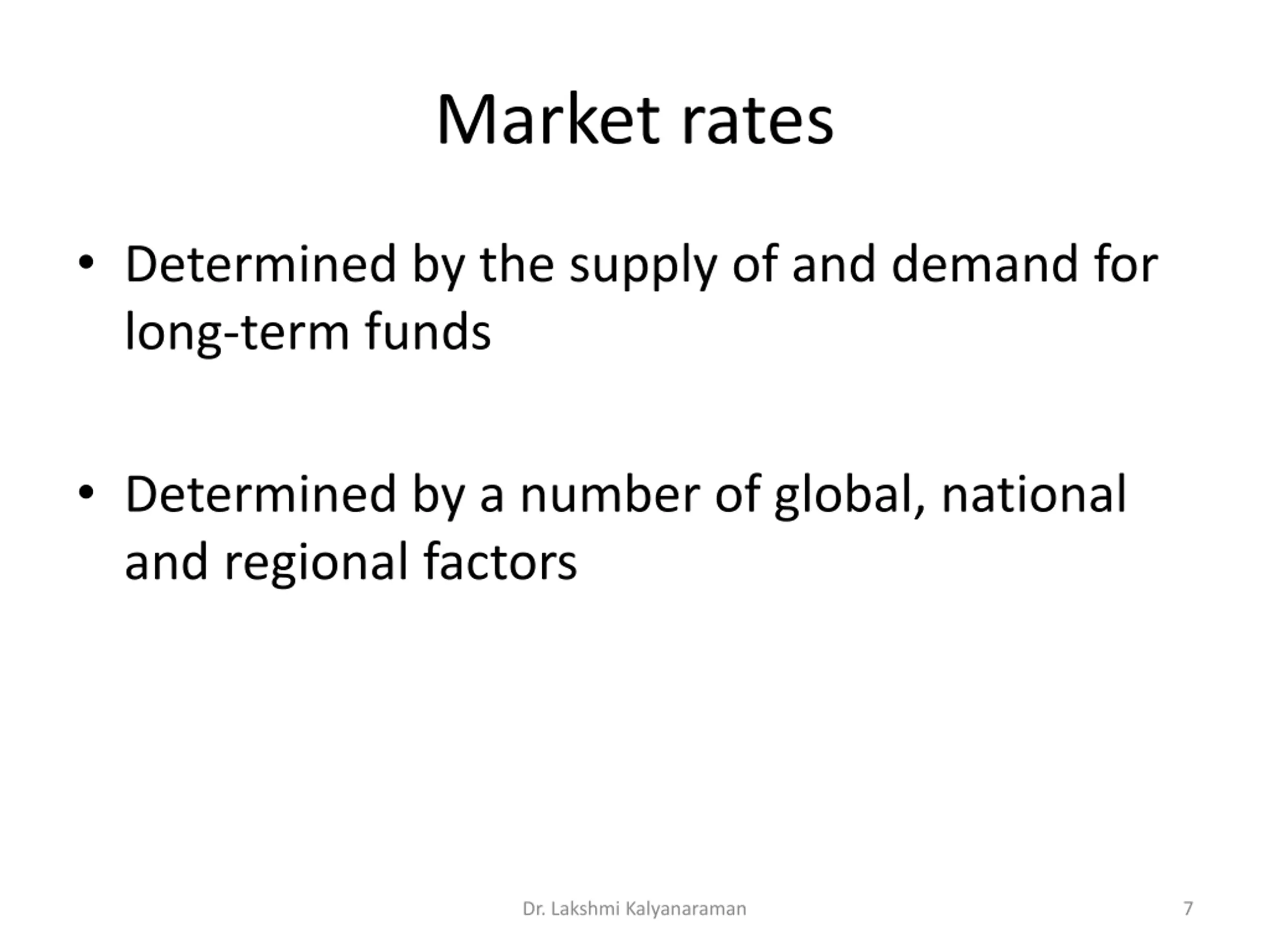 Market rates Determined by the supply of and demand for long-term funds Determined by a number of global, national and regional factors Dr. Lakshmi Kalyanaraman 7