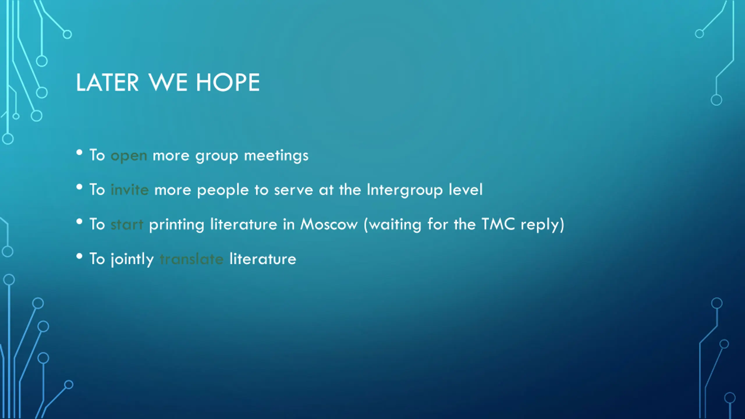 LATER WE HOPE To open more group meetings To invite more people to serve at the Intergroup level To start printing literature in Moscow (waiting for the TMC reply) To jointly translate literature