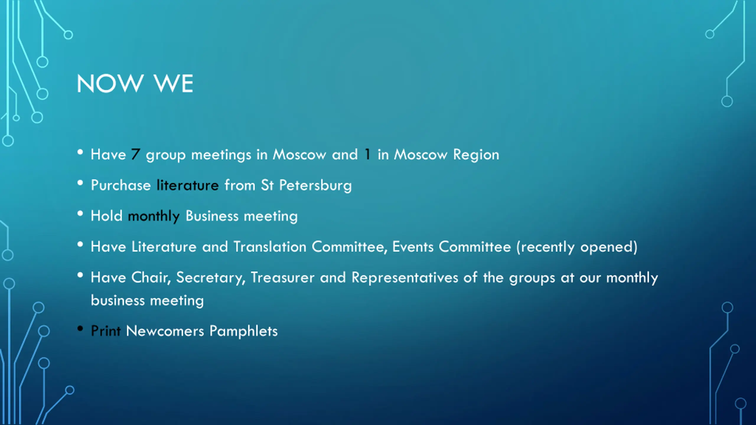 NOW WE Have 7 group meetings in Moscow and 1 in Moscow Region Purchase literature from St Petersburg Hold monthly Business meeting Have Literature and Translation Committee, Events Committee (recently opened) Have Chair, Secretary, Treasurer and Representatives of the groups at our monthly business meeting Print Newcomers Pamphlets