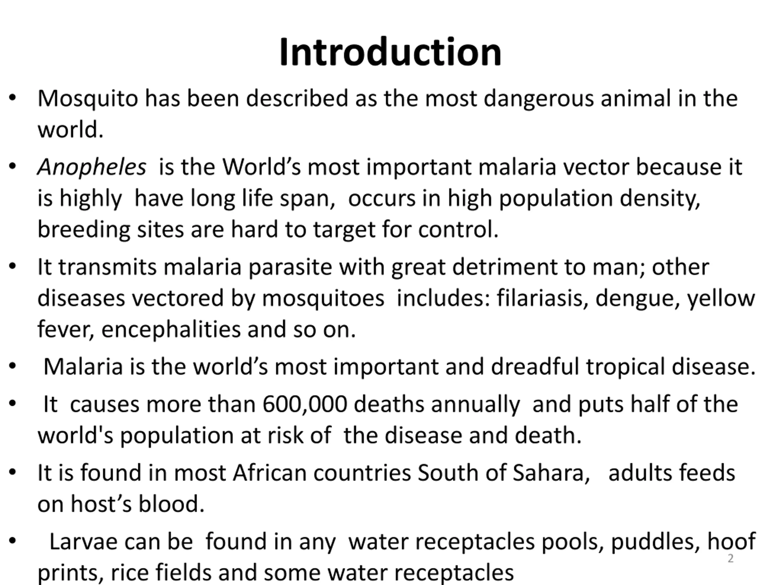 Introduction Mosquito has been described as the most dangerous animal in the world. Anopheles is the World s most important malaria vector because it is highly have long life span, occurs in high population density, breeding sites are hard to target for control. It transmits malaria parasite with great detriment to man; other diseases vectored by mosquitoes includes: filariasis, dengue, yellow fever, encephalities and so on. Malaria is the world s most important and dreadful tropical disease. It causes more than 600,000 deaths annually and puts half of the world's population at risk of the disease and death. It is found in most African countries South of Sahara, adults feeds on host s blood. Larvae can be found in any water receptacles pools, puddles, hoof prints, rice fields and some water receptacles 2