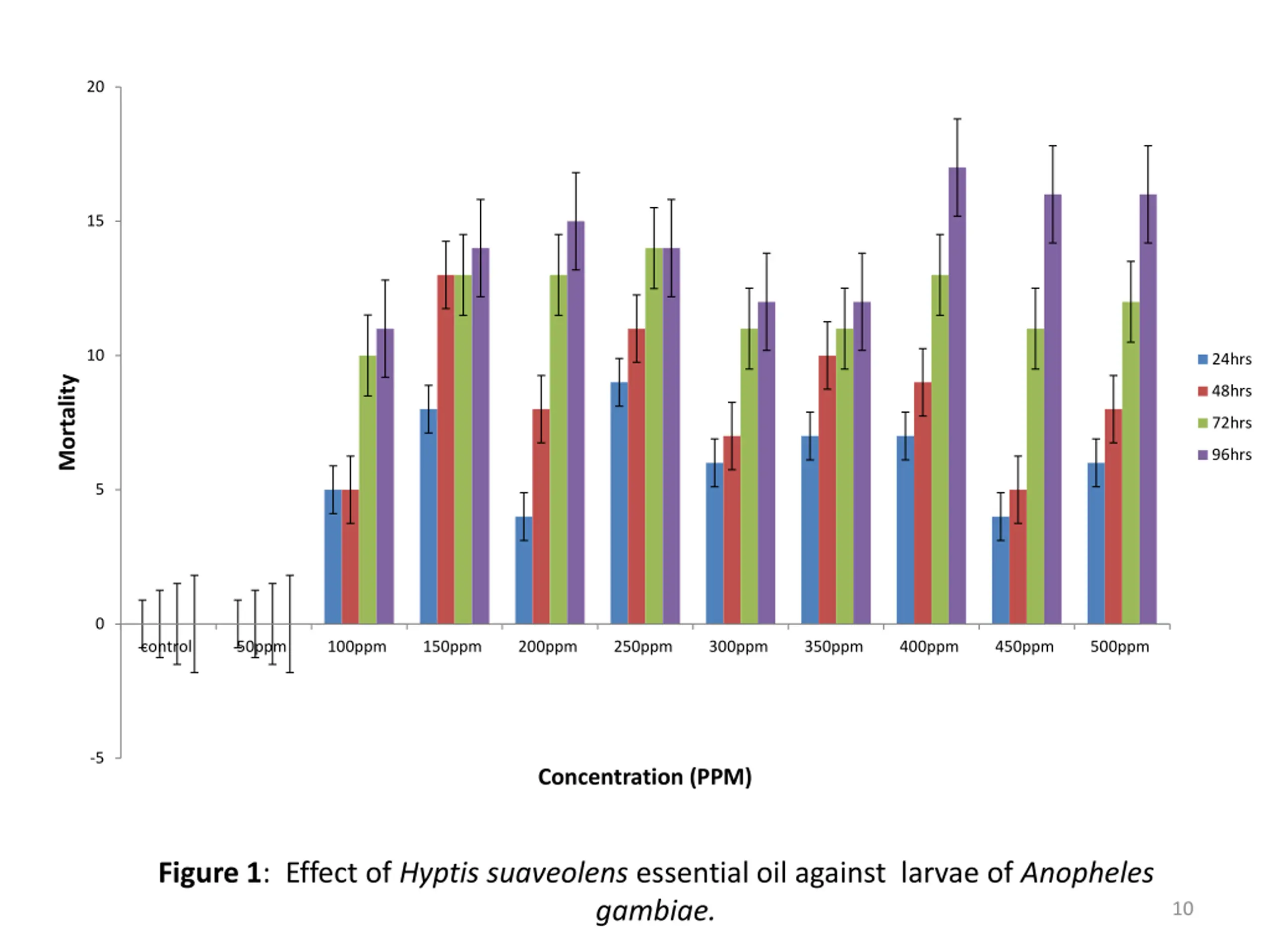 Mosquitoes, especially Anopheles, pose a significant threat as disease vectors. This study explores the insecticidal properties of Hyptis suaveolens on Anopheles gambiae, aiming to determine its effectiveness in controlling mosquito populations and transmission of diseases. The research focuses on the toxicity of essential oil and powdered extract of the plant, providing valuable insights for potential mosquito control strategies. Key findings, such as mortality rates of larvae at different concentrations, shed light on the effectiveness of Hyptis suaveolens in combating Anopheles gambiae.