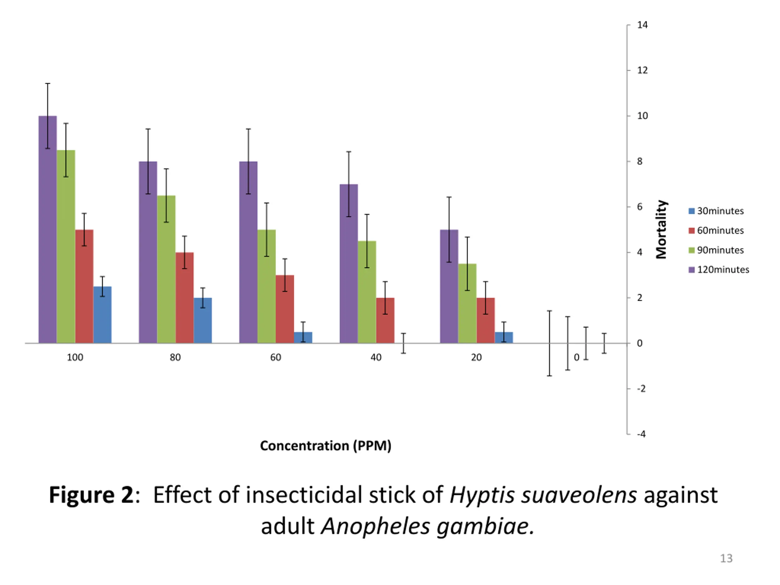 14 12 10 8 Mortality 6 30minutes 60minutes 90minutes 4 120minutes 2 0 100 80 60 40 20 0 -2 -4 Concentration (PPM) Figure 2: Effect of insecticidal stick of Hyptis suaveolens against adult Anopheles gambiae. 13