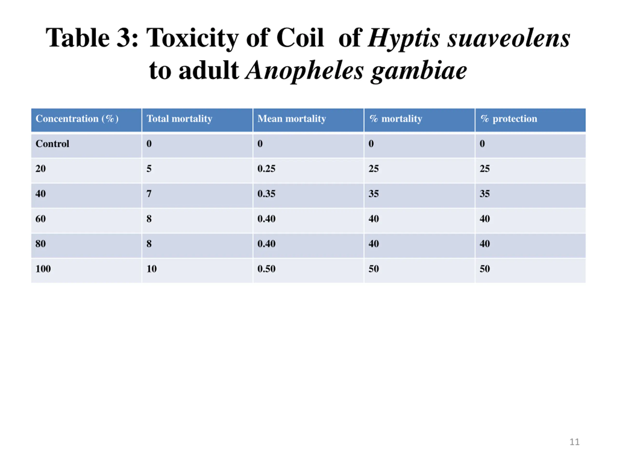 Table 3: Toxicity of Coil of Hyptis suaveolens to adult Anopheles gambiae Concentration (%) Total mortality Mean mortality % mortality % protection Control 0 0 0 0 20 5 0.25 25 25 40 7 0.35 35 35 60 8 0.40 40 40 80 8 0.40 40 40 100 10 0.50 50 50 11