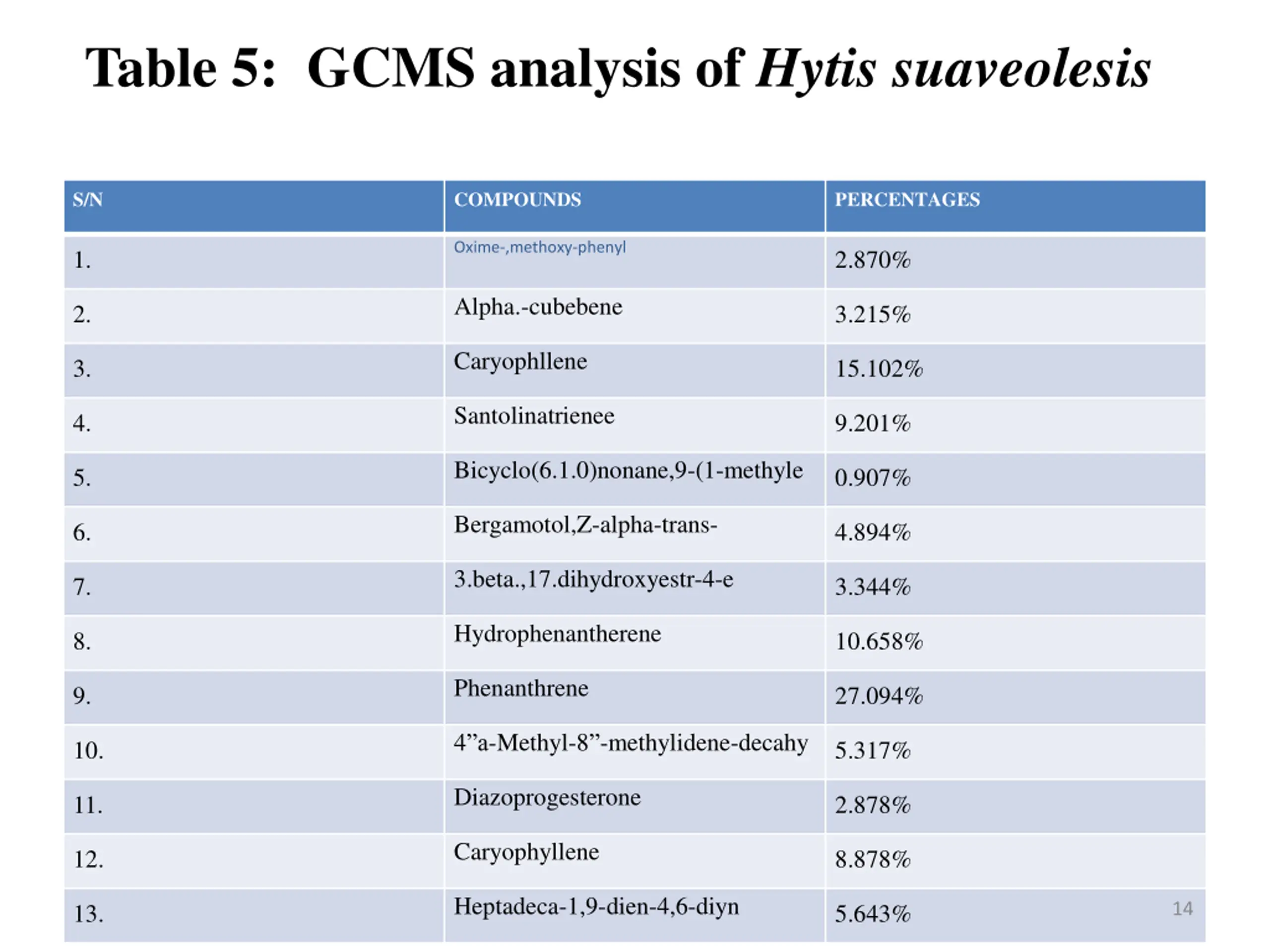 Table 5: GCMS analysis of Hytis suaveolesis S/N COMPOUNDS PERCENTAGES Oxime-,methoxy-phenyl 1. 2.870% Alpha.-cubebene 2. 3.215% Caryophllene 3. 15.102% Santolinatrienee 4. 9.201% Bicyclo(6.1.0)nonane,9-(1-methyle 5. 0.907% Bergamotol,Z-alpha-trans- 6. 4.894% 3.beta.,17.dihydroxyestr-4-e 7. 3.344% Hydrophenantherene 8. 10.658% Phenanthrene 9. 27.094% 4 a-Methyl-8 -methylidene-decahy 10. 5.317% Diazoprogesterone 11. 2.878% Caryophyllene 12. 8.878% Heptadeca-1,9-dien-4,6-diyn 14 13. 5.643%