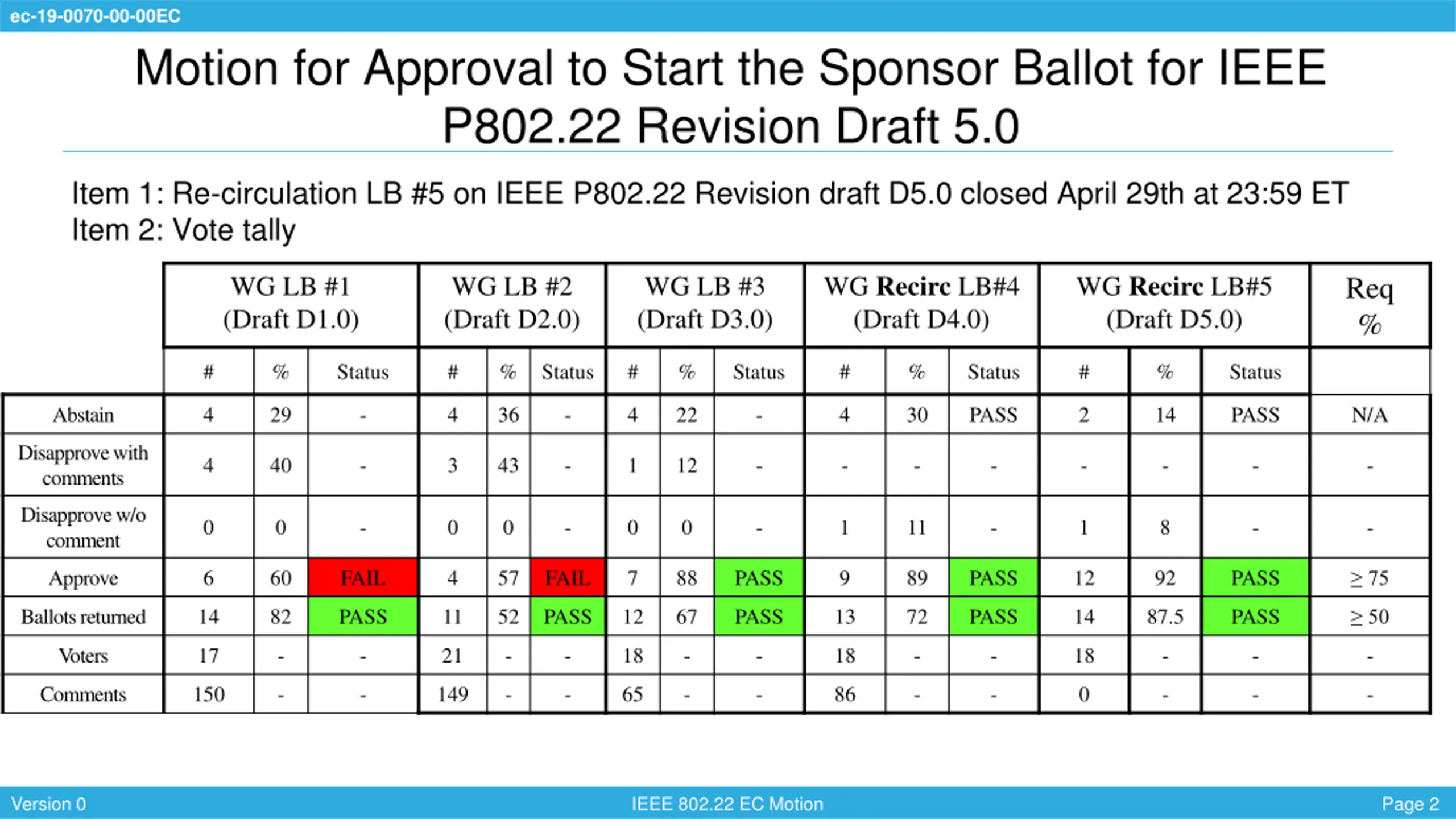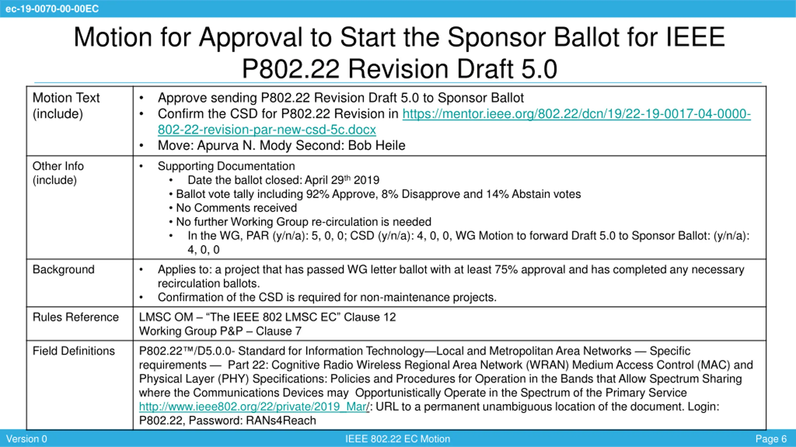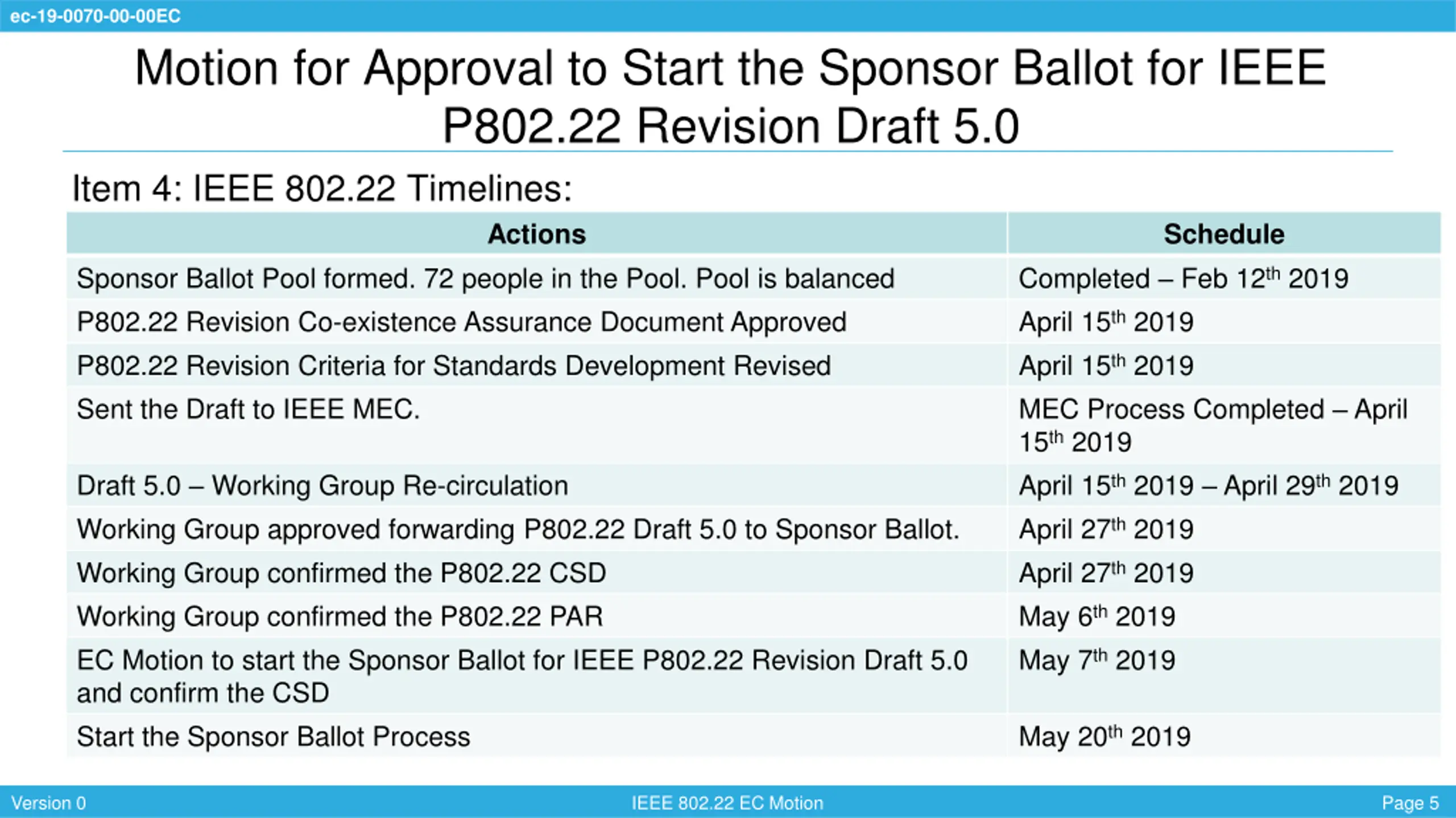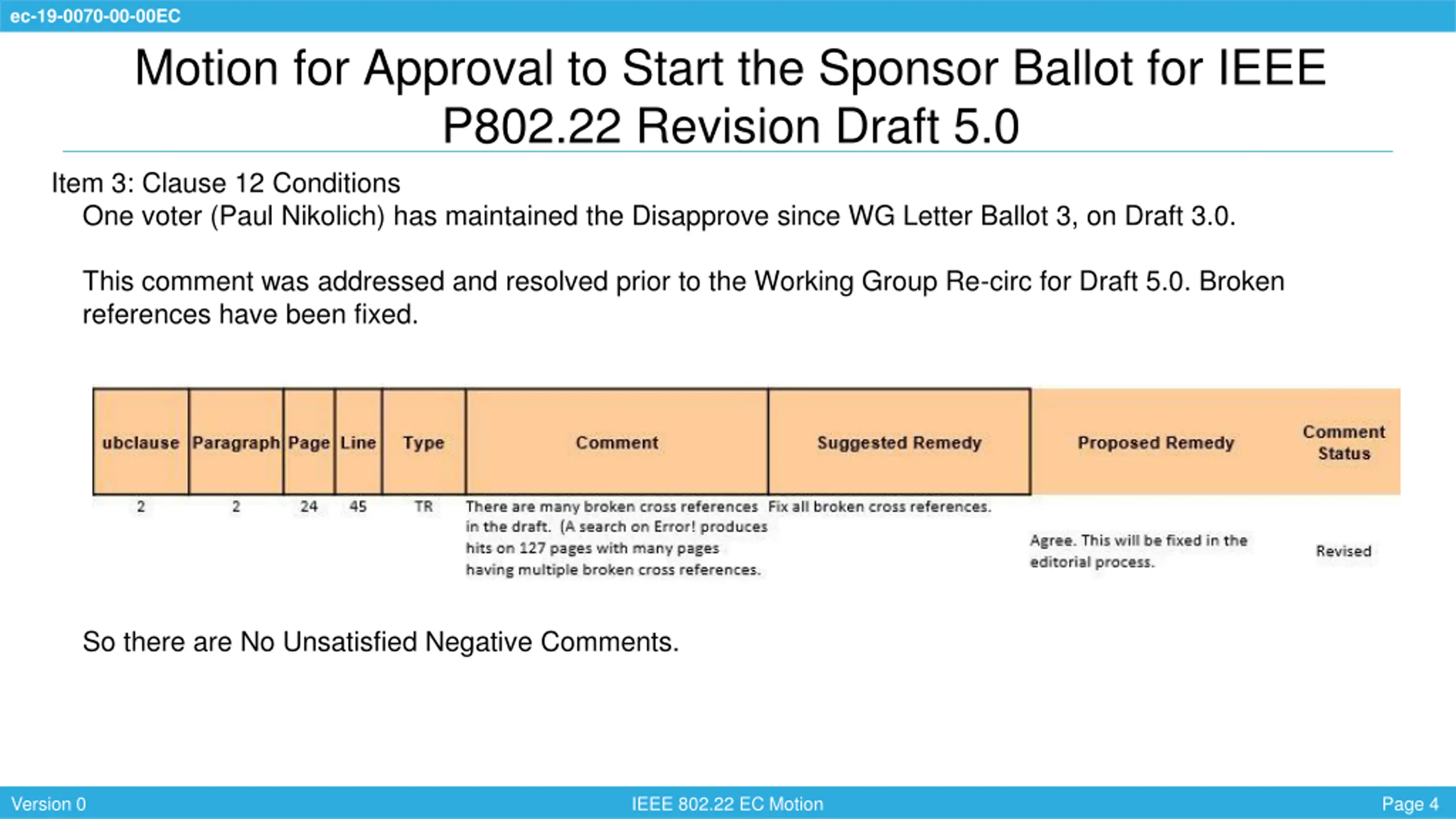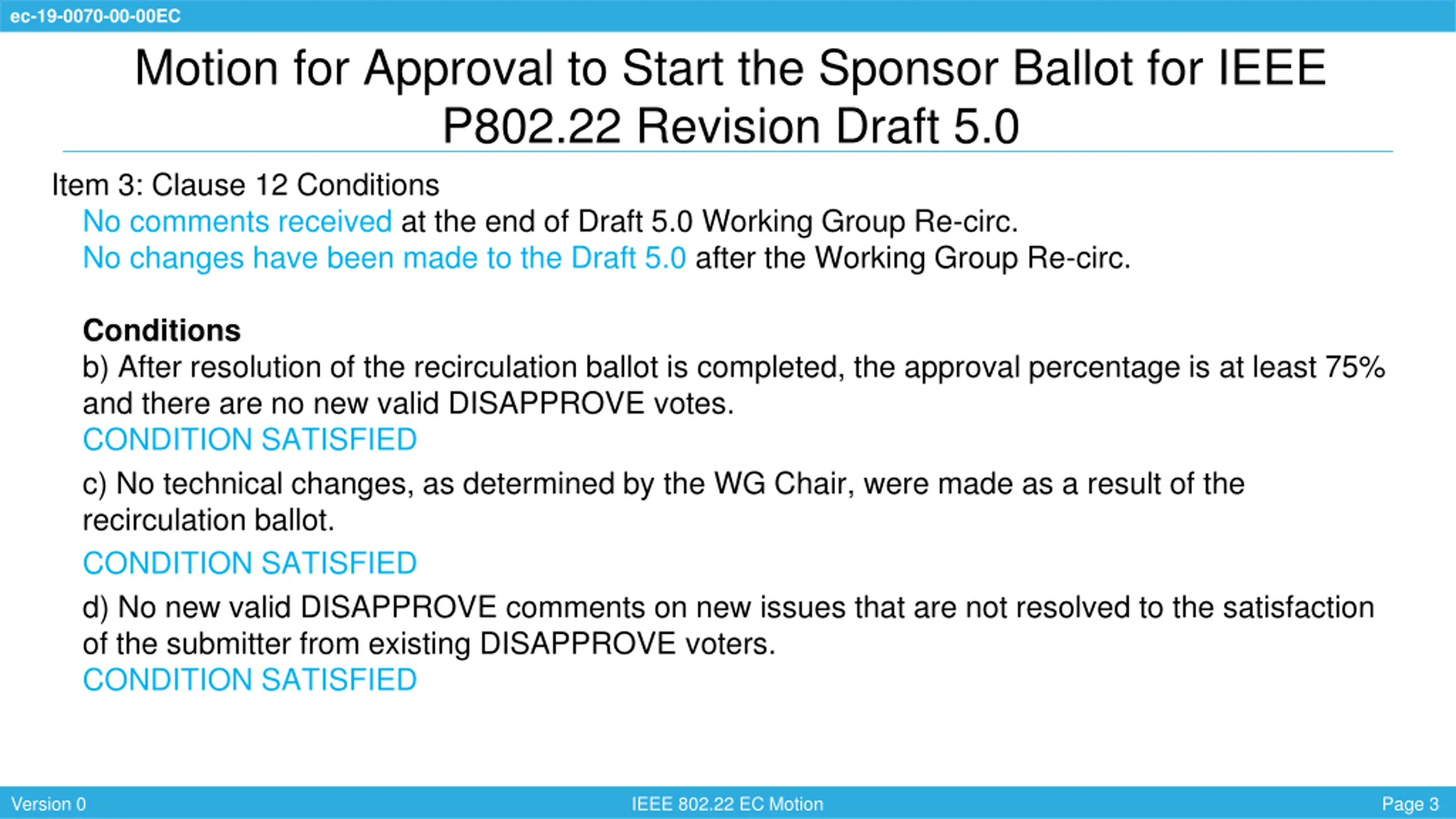 ec-19-0070-00-00EC Motion for Approval to Start the Sponsor Ballot for IEEE P802.22 Revision Draft 5.0 Item 3: Clause 12 Conditions One voter (Paul Nikolich) has maintained the Disapprove since WG Letter Ballot 3, on Draft 3.0. This comment was addressed and resolved prior to the Working Group Re-circ for Draft 5.0. Broken references have been fixed. So there are No Unsatisfied Negative Comments. Version 0 Page 4 IEEE 802.22 EC Motion