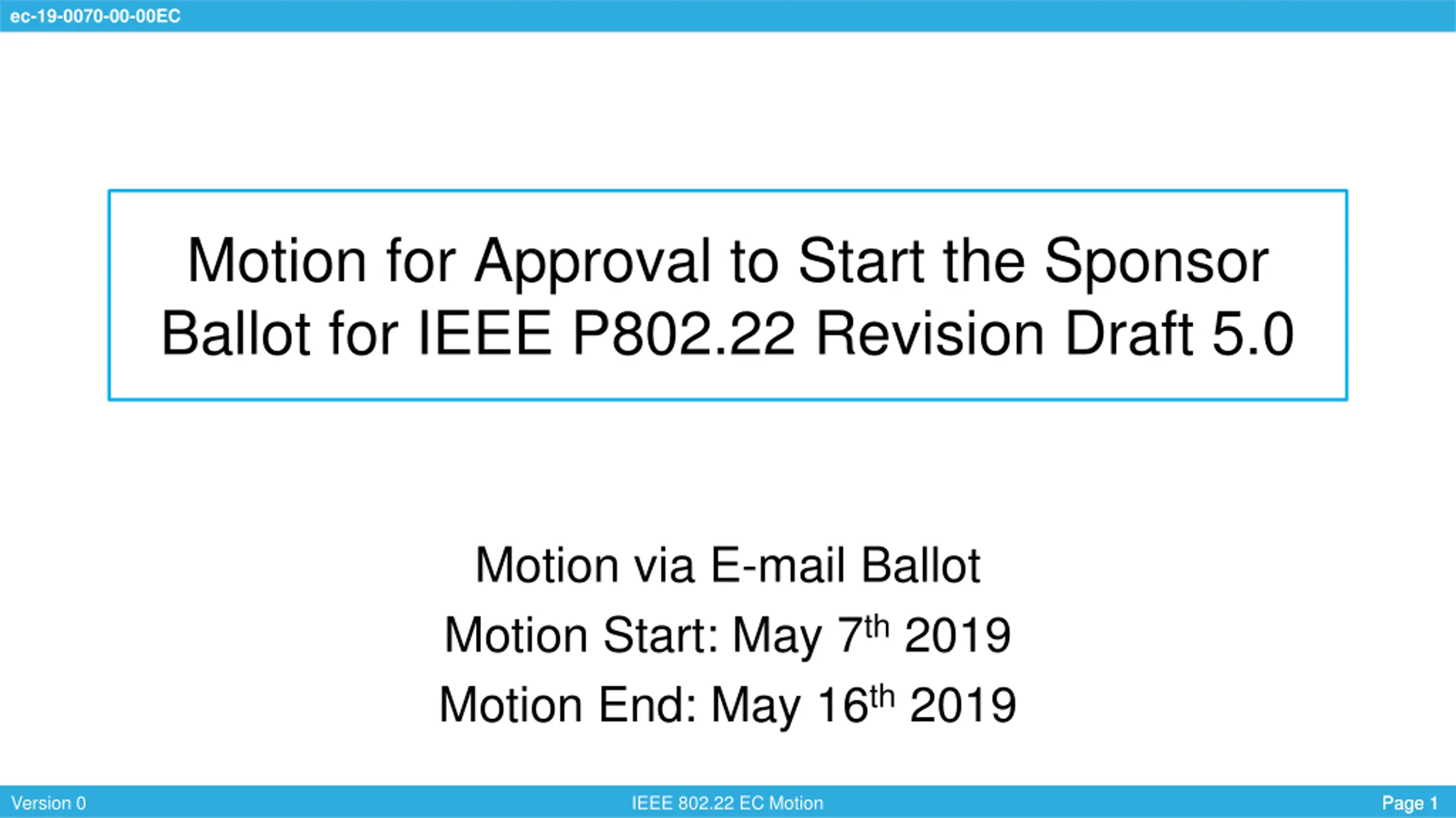 ec-19-0070-00-00EC Motion for Approval to Start the Sponsor Ballot for IEEE P802.22 Revision Draft 5.0 Motion via E-mail Ballot Motion Start: May 7th2019 Motion End: May 16th2019 Version 0 Page 1 Page 1 IEEE 802.22 EC Motion