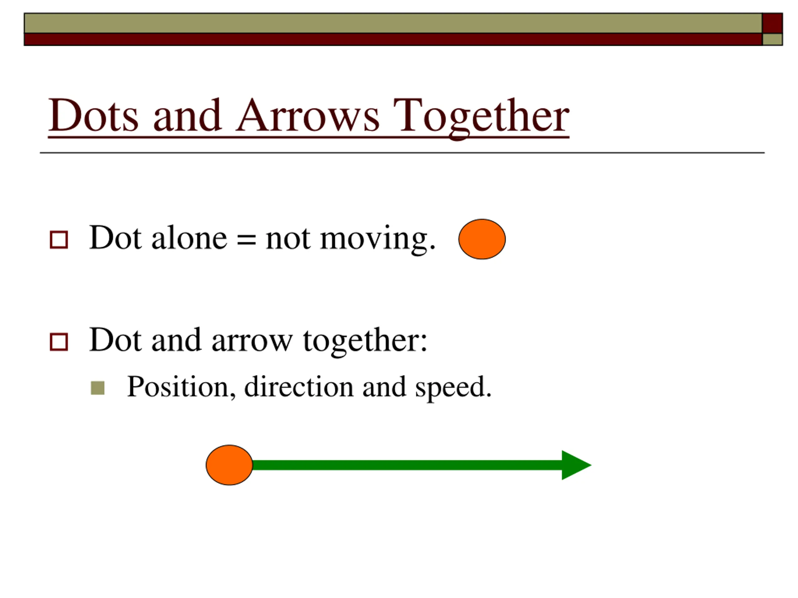 Dots and Arrows Together Dot alone = not moving. Dot and arrow together: Position, direction and speed.