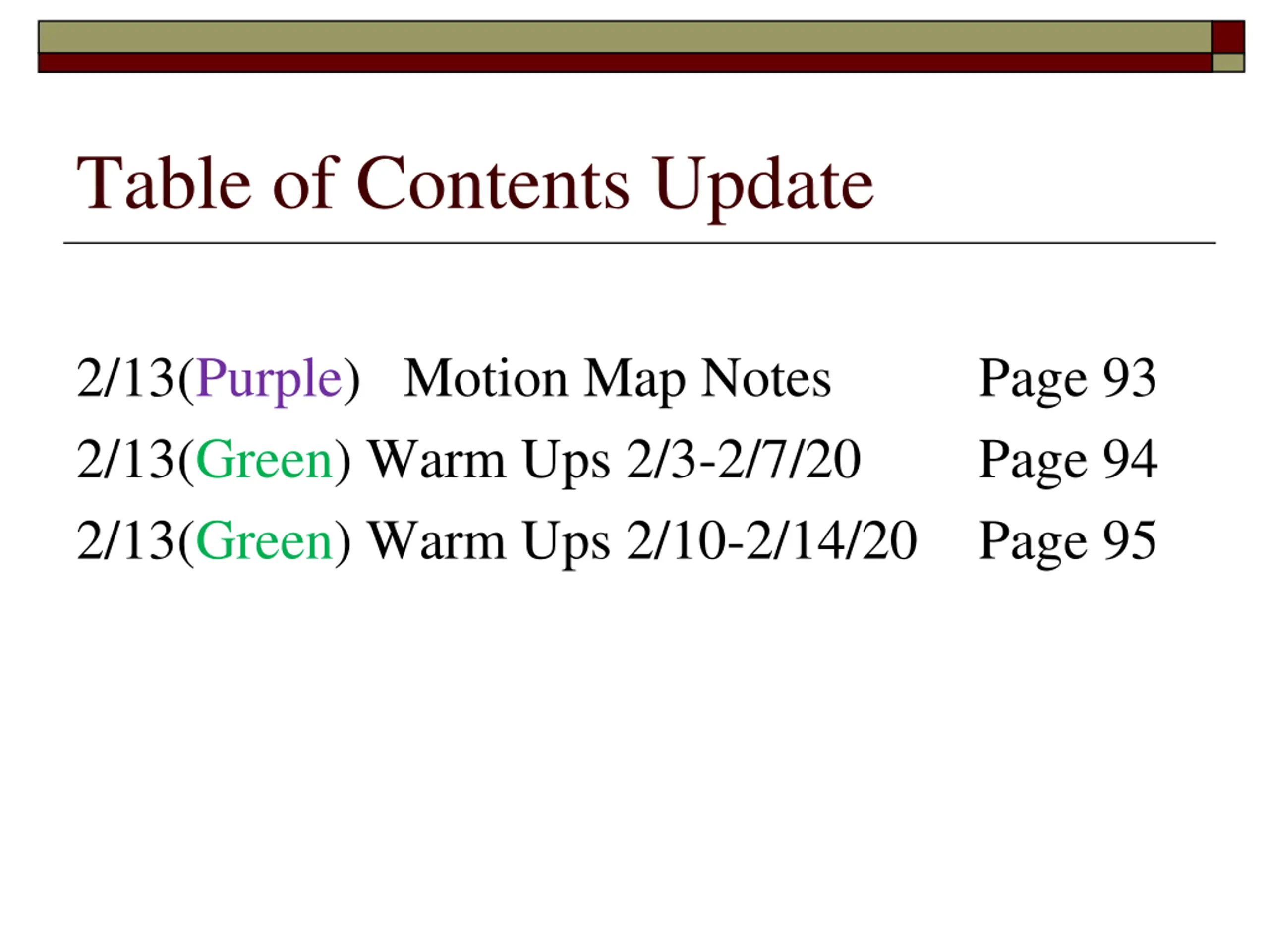 Table of Contents Update 2/13(Purple) Motion Map Notes 2/13(Green) Warm Ups 2/3-2/7/20 2/13(Green) Warm Ups 2/10-2/14/20 Page 95 Page 93 Page 94